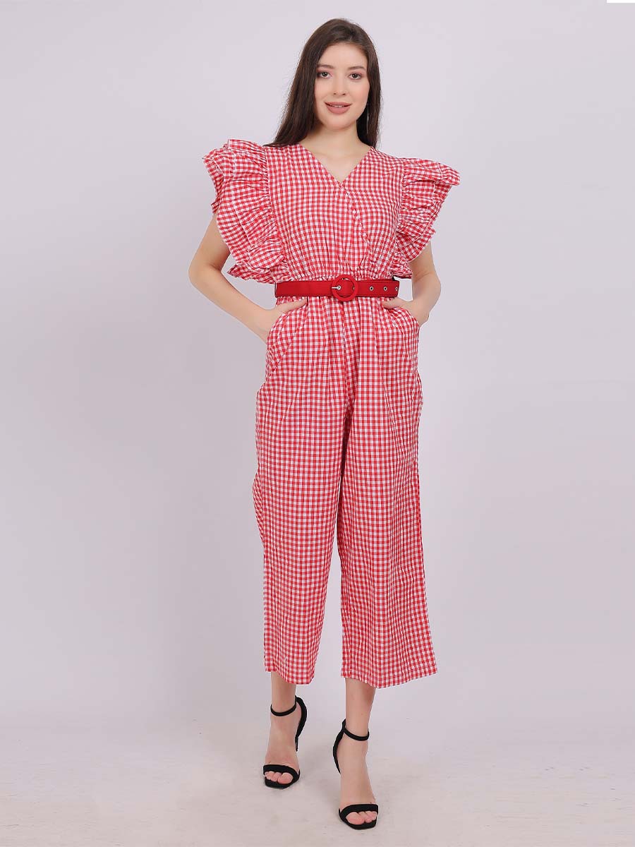 Cotton Checks Jumpsuit With Fashion Sleevess & Belt