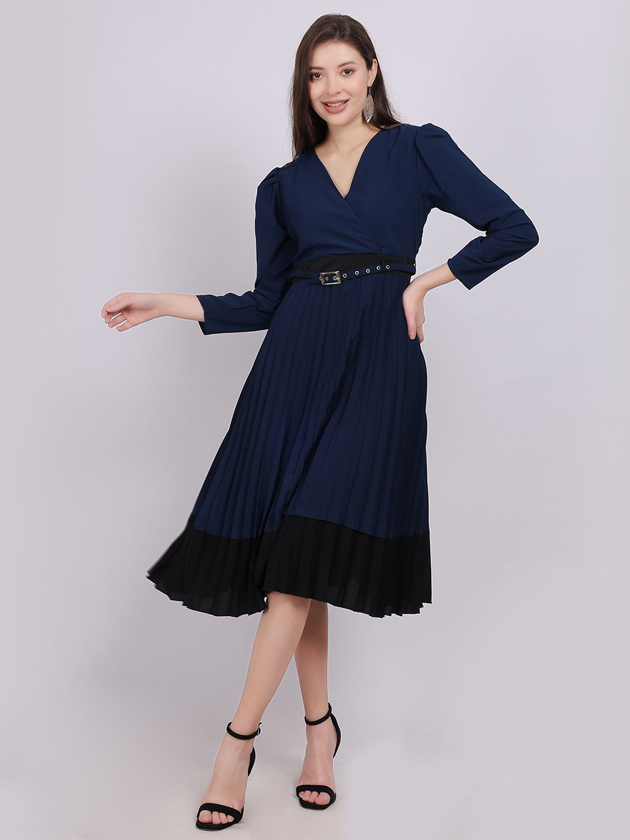 Navy Solid Pleated Fashion Dress With Puff Sleeves