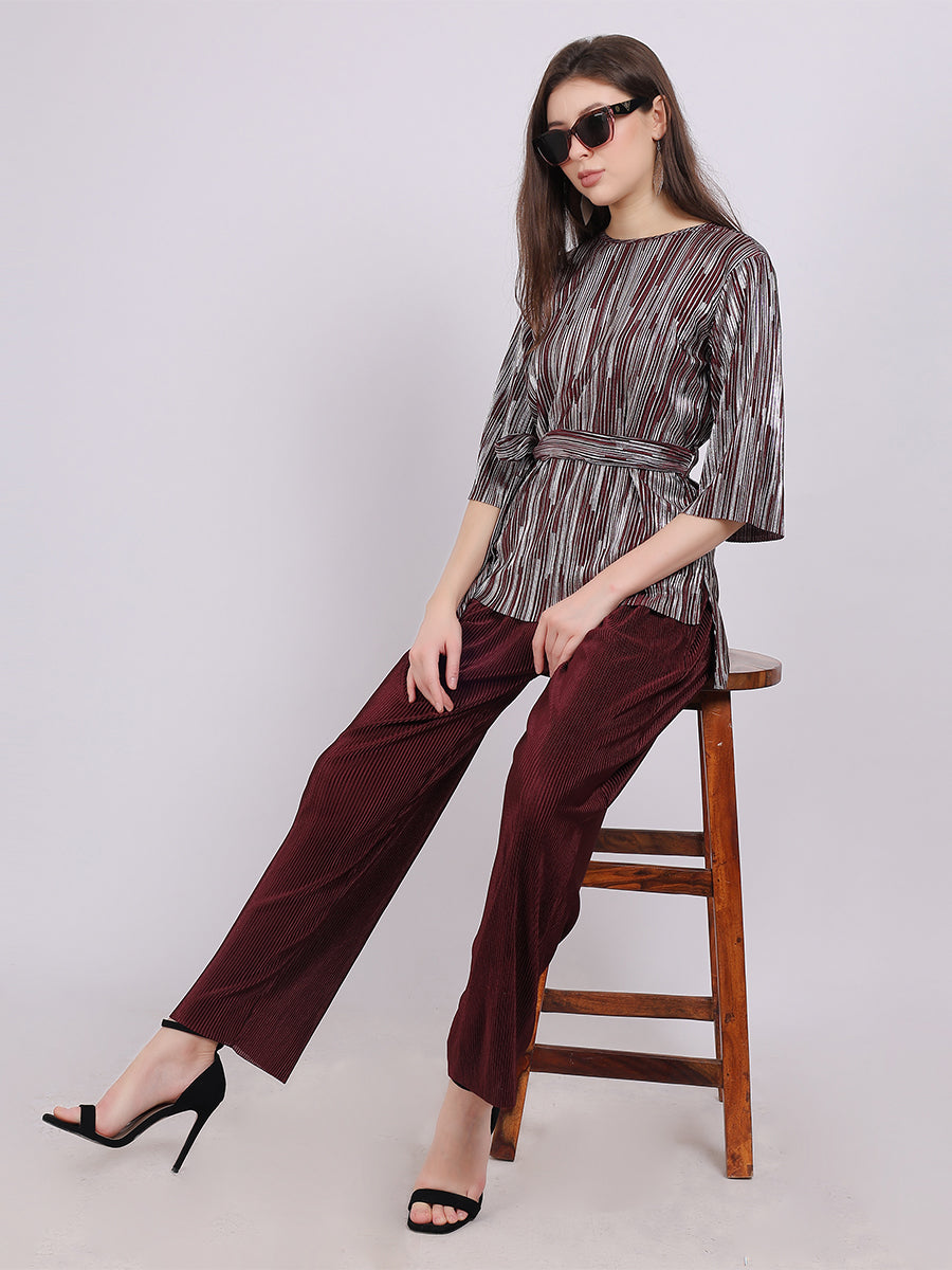 Solid Shimmer Pleated Fashion Co-ord-Set With Fabric Belt