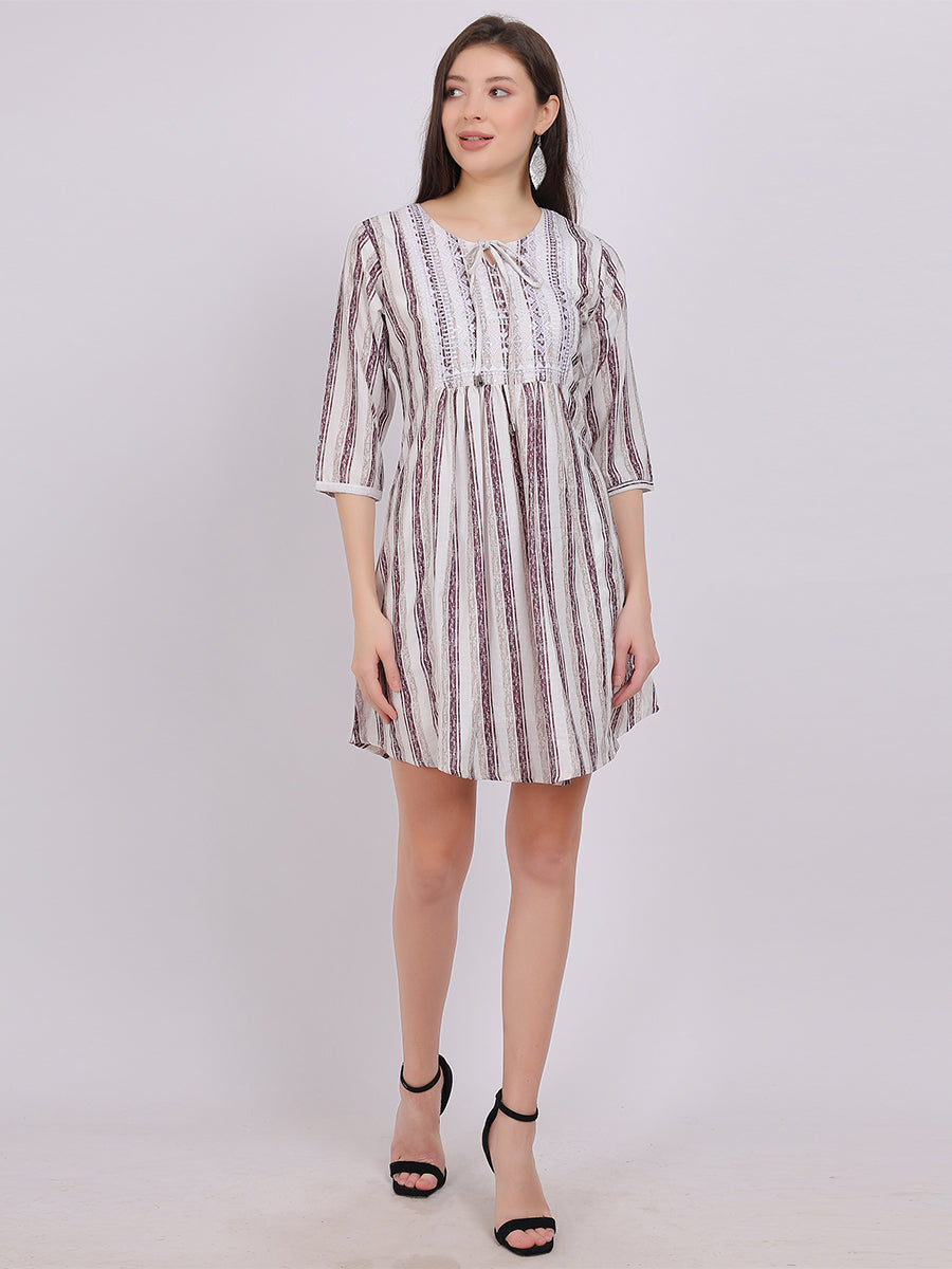 Wine Stripe Print Long Tunic Fashion Top With Neck Embroidery