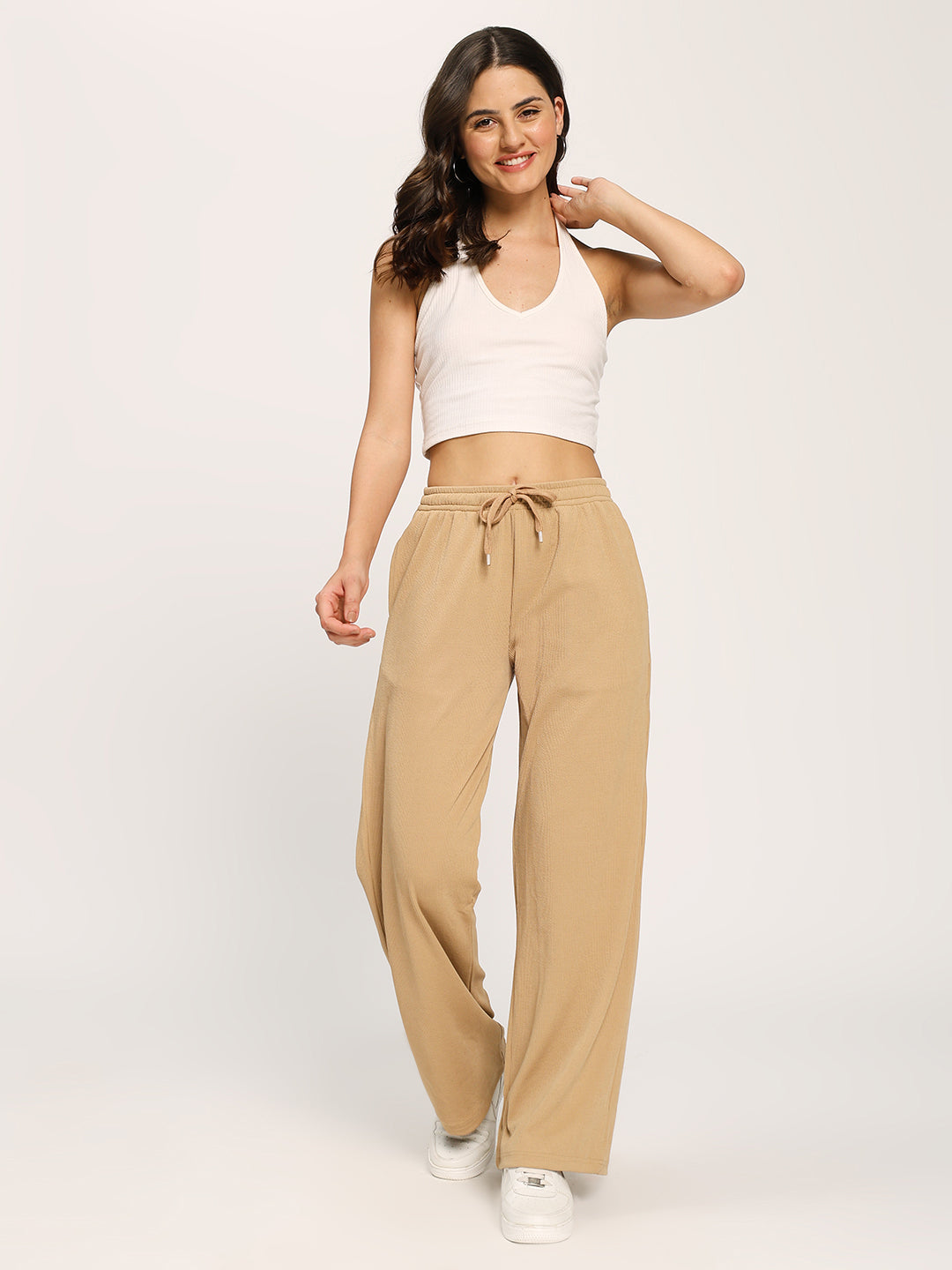 Beige Textured Rib Straight Fit Fashion Pants