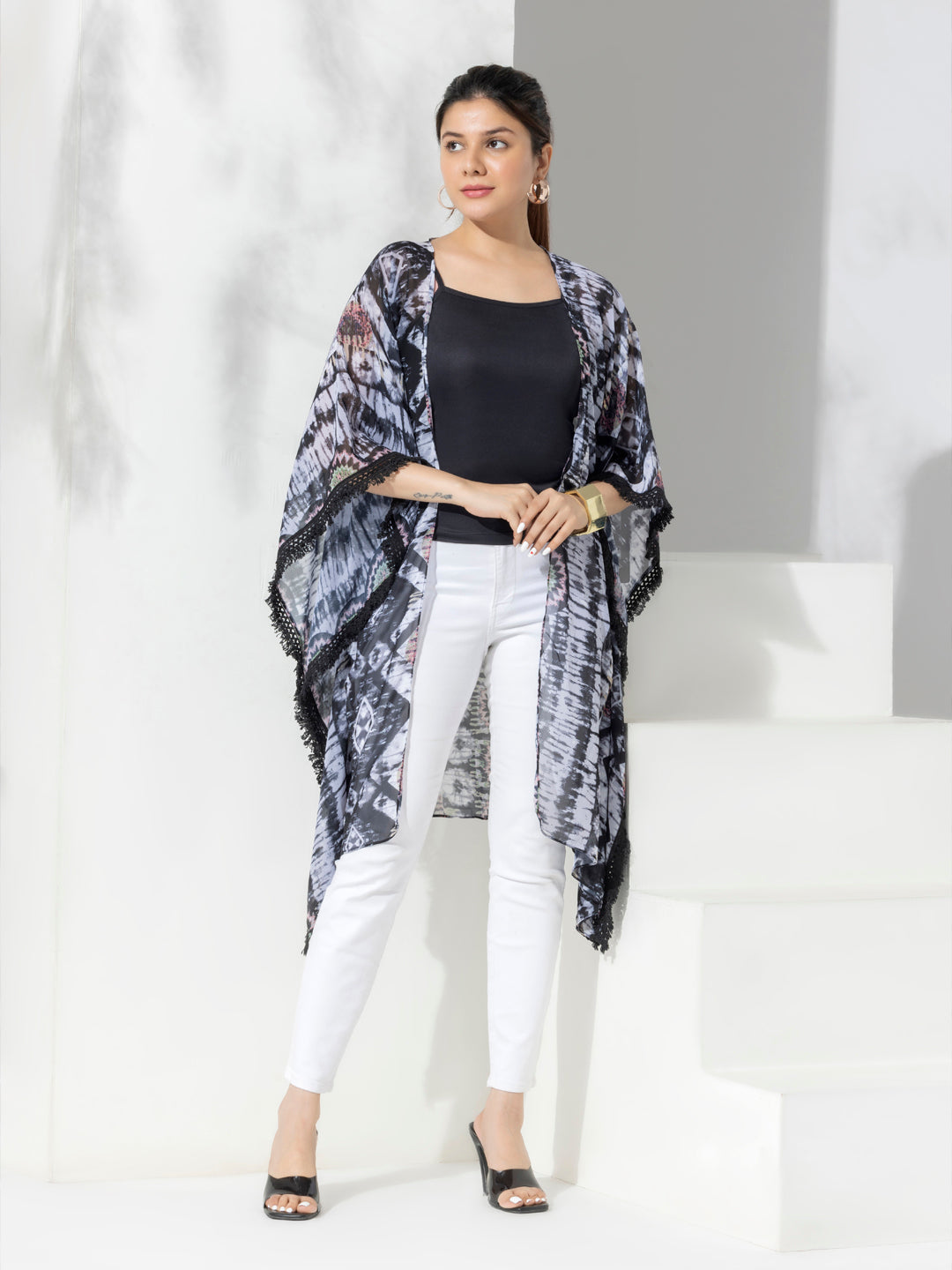 Black Bohemian Fashion Printed Shrug With Lace