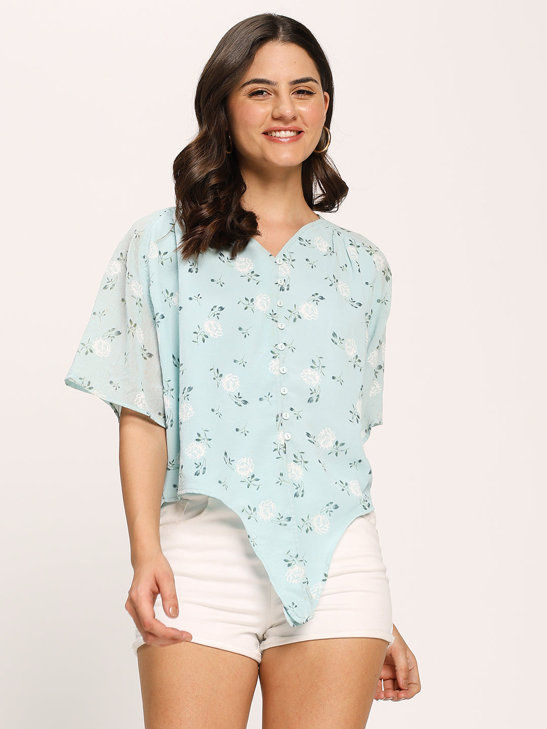 Blue Floral Print Crop Knot Shirt