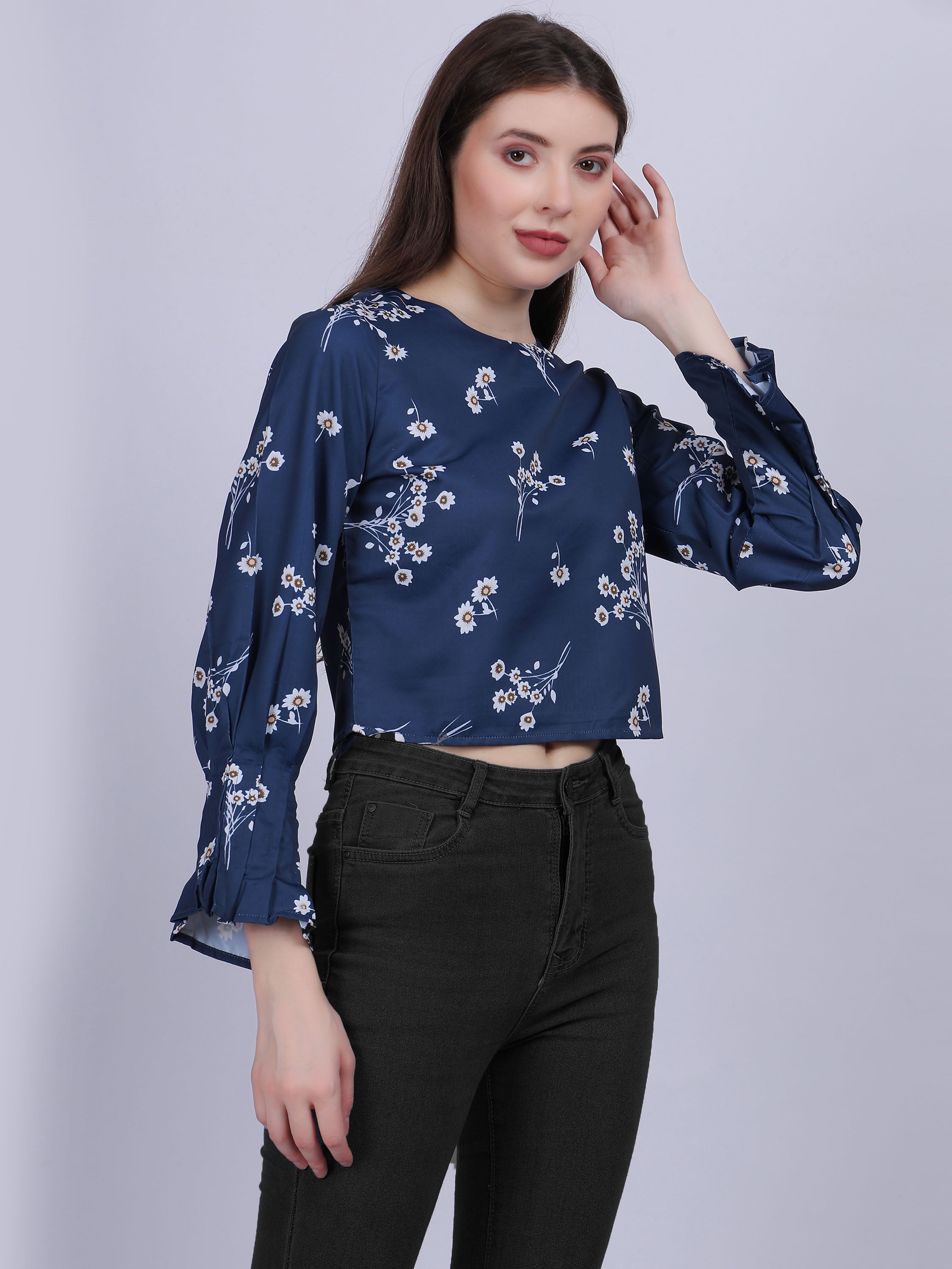 Blue Floral Print Crop Top With Pleated Cuff Sleeves