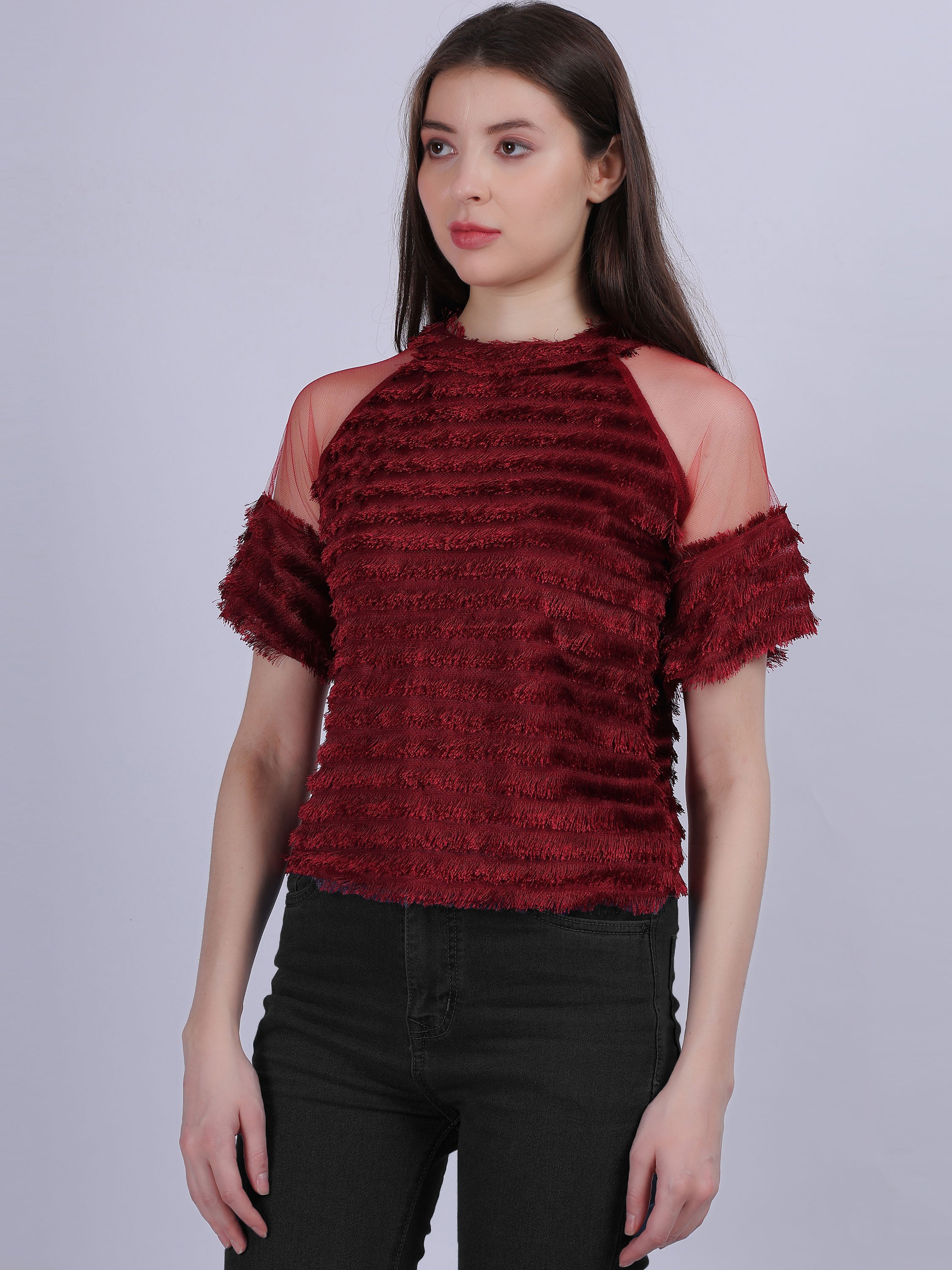 Maroon Casual Soft Fur Crop Top With Mesh Sleeves