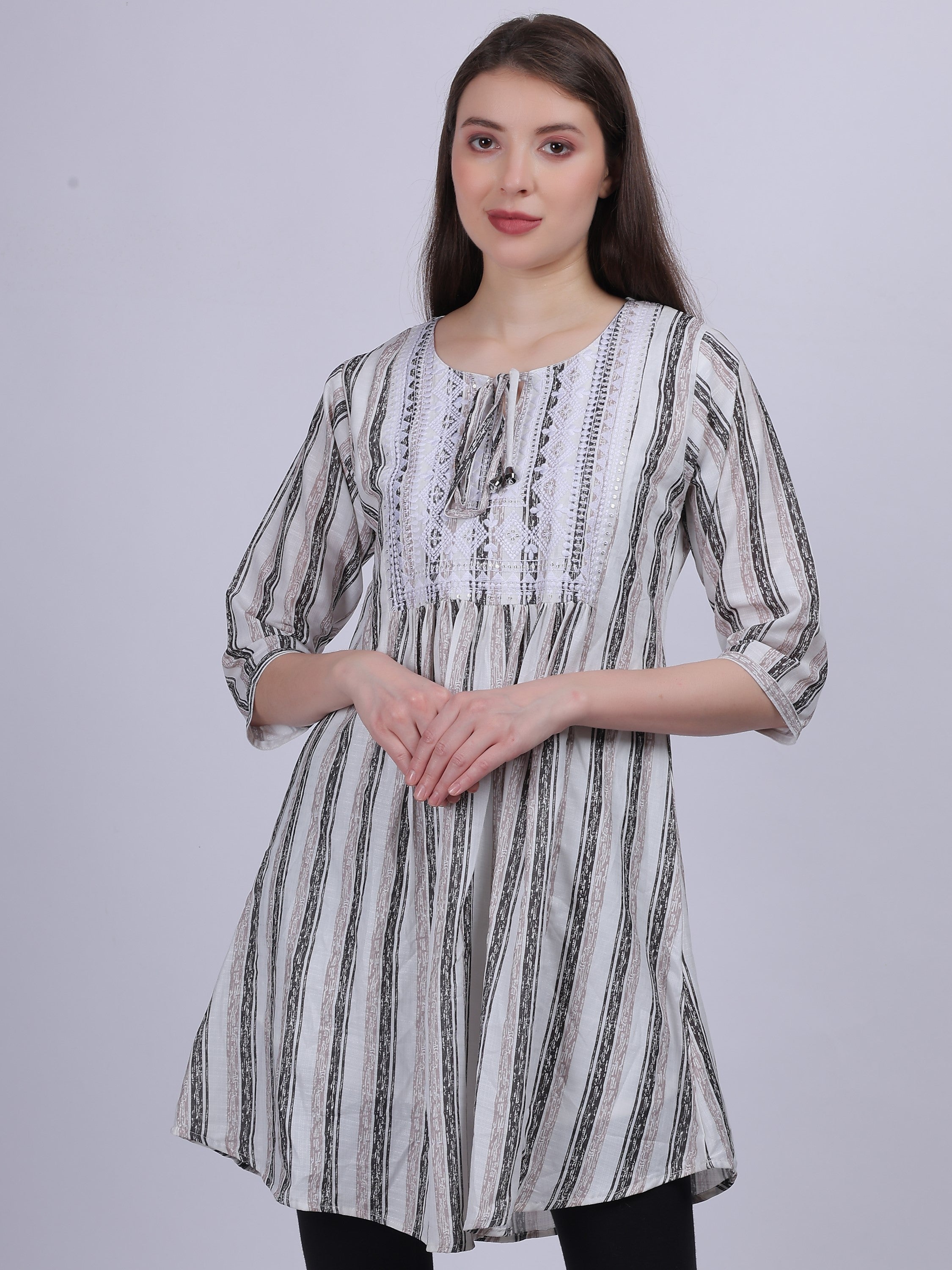 Introducing the AUMBE Stripe Print Long Tunic Fashion Top with Neck Embroidery, a stylish blend of casual elegance and intricate detail. This tunic features a classic stripe print complemented by exquisite neck embroidery, offering a refined and chic look. Perfect for both casual outings and semi-formal occasions, it ensures you look effortlessly fashionable.