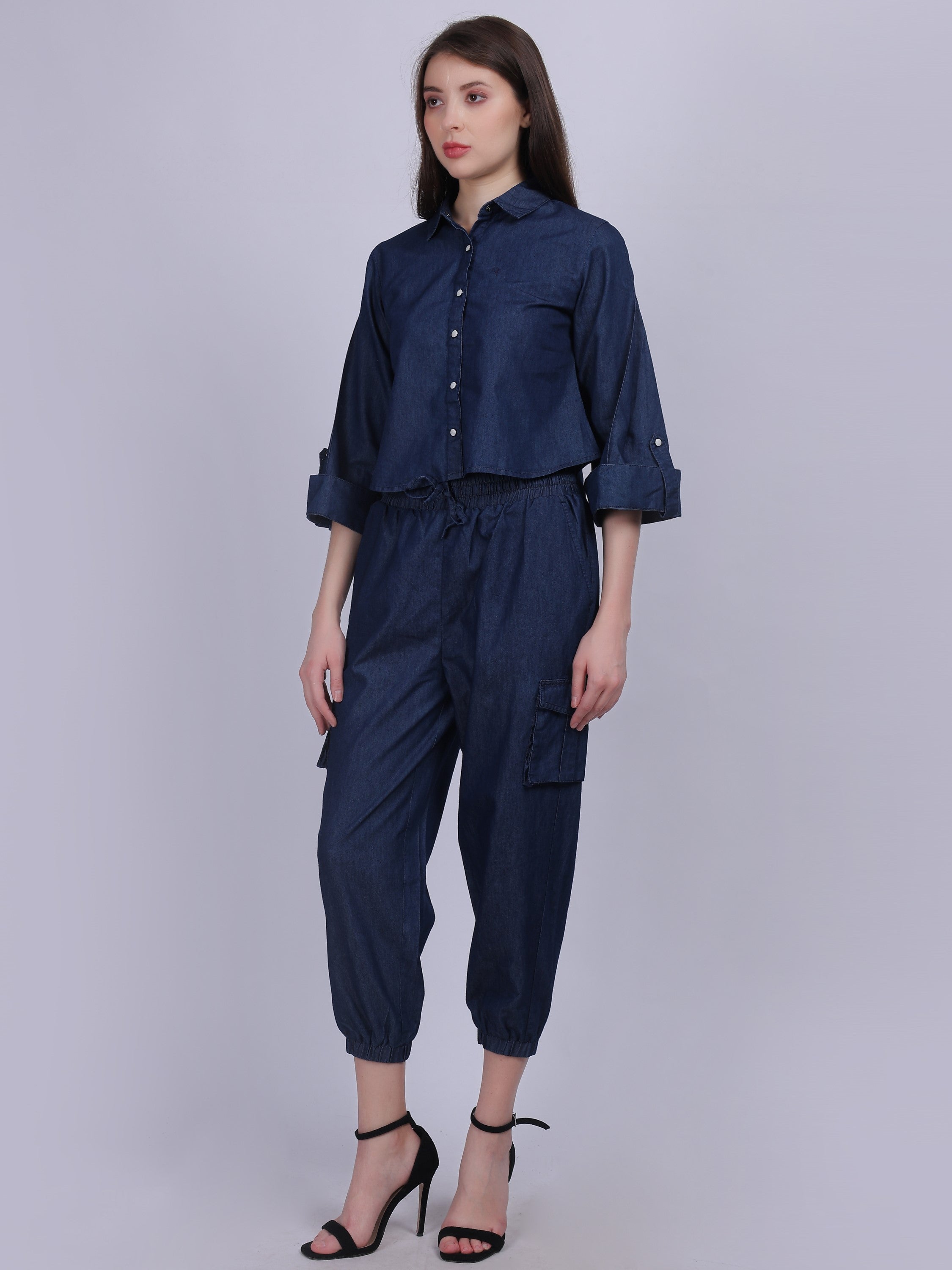 Dark Blue Denim Cord-set With Crop Top & Straight Fit Pants