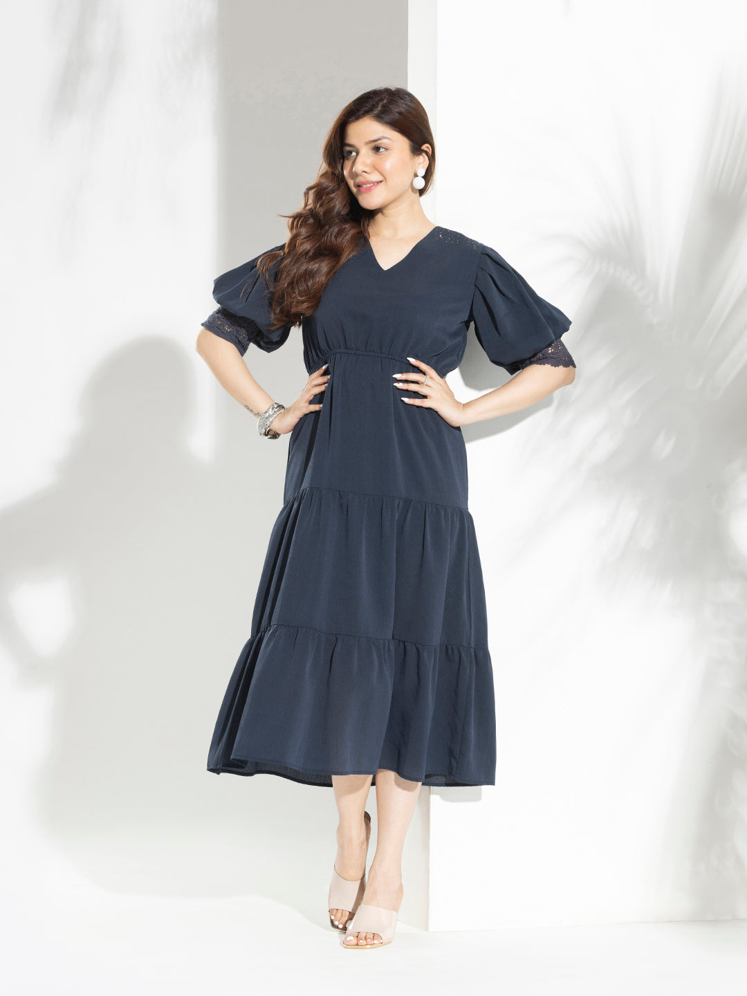 Fashion Layered Dress With Ballon Sleeves & Lace Emblishment