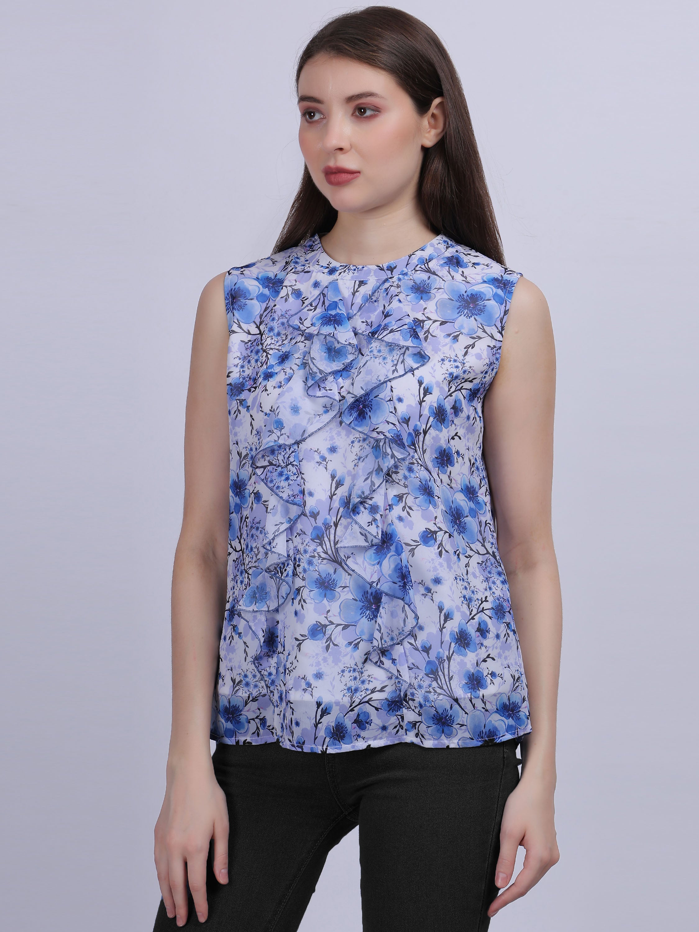 Blue Floral Print Basic Fashion Ruffle Top