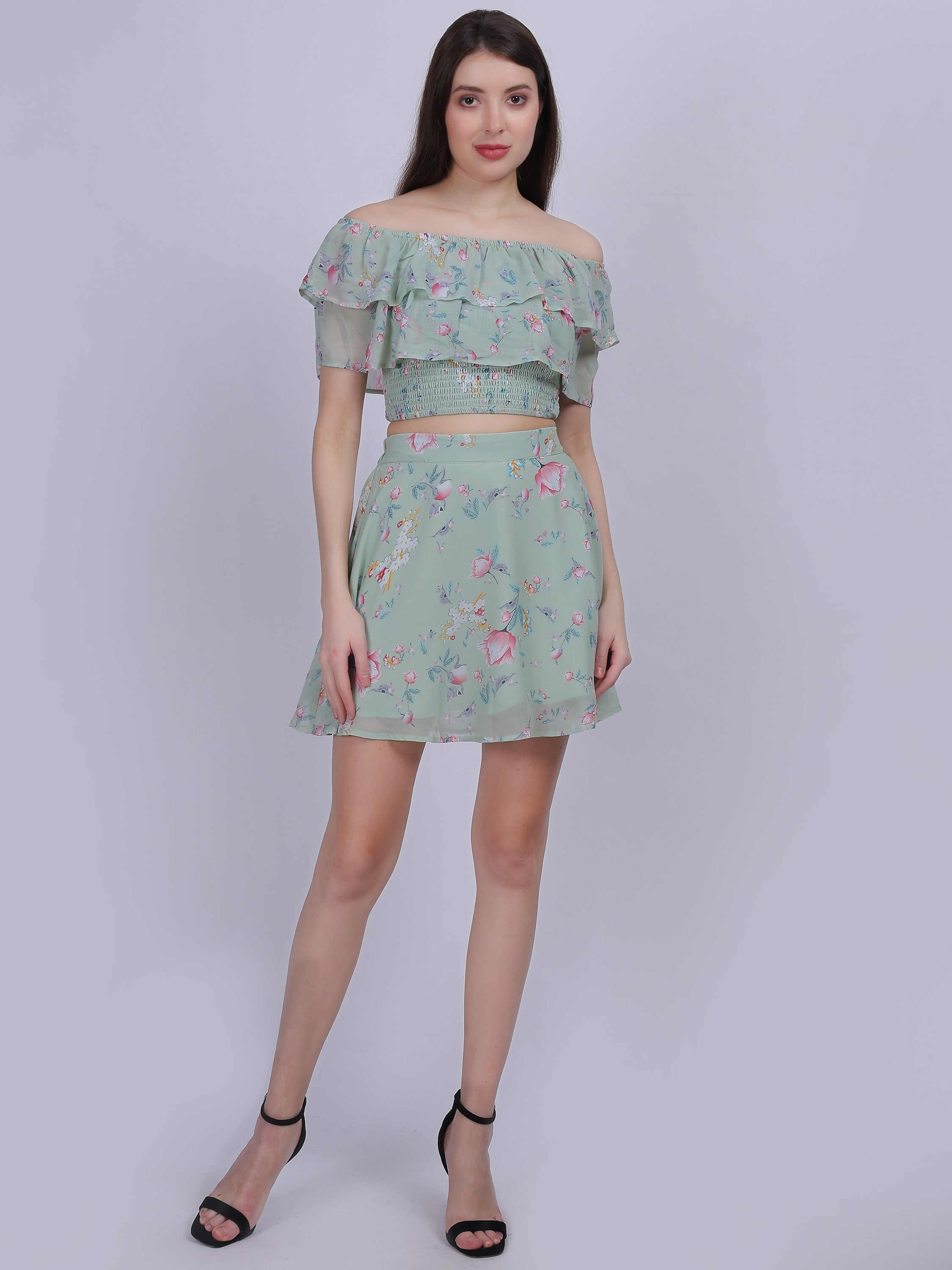 Green Floral Print Fashion Cord-set With Short Off-shoulder Top & Skirt