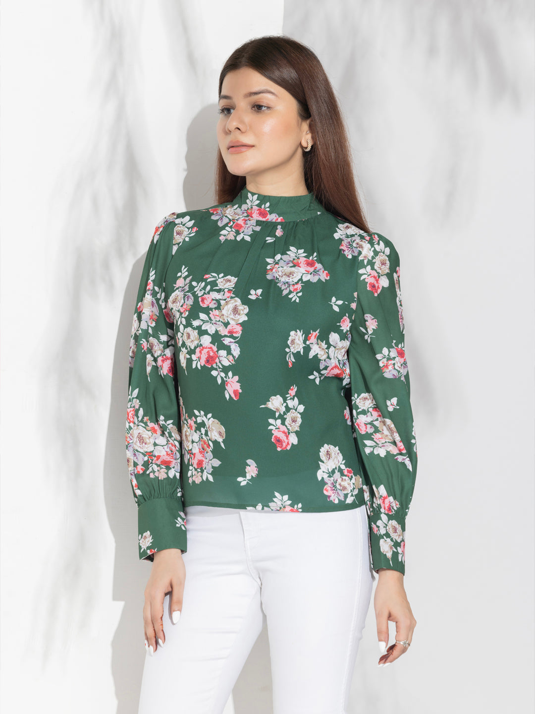Introducing the AUMBE Floral Print High Neck Fancy Top, a perfect mix of sophistication and style. Featuring a flattering high neck design and a vibrant floral print, this top exudes elegance. Ideal for both casual and semi-formal occasions, it adds a chic touch to any outfit.
