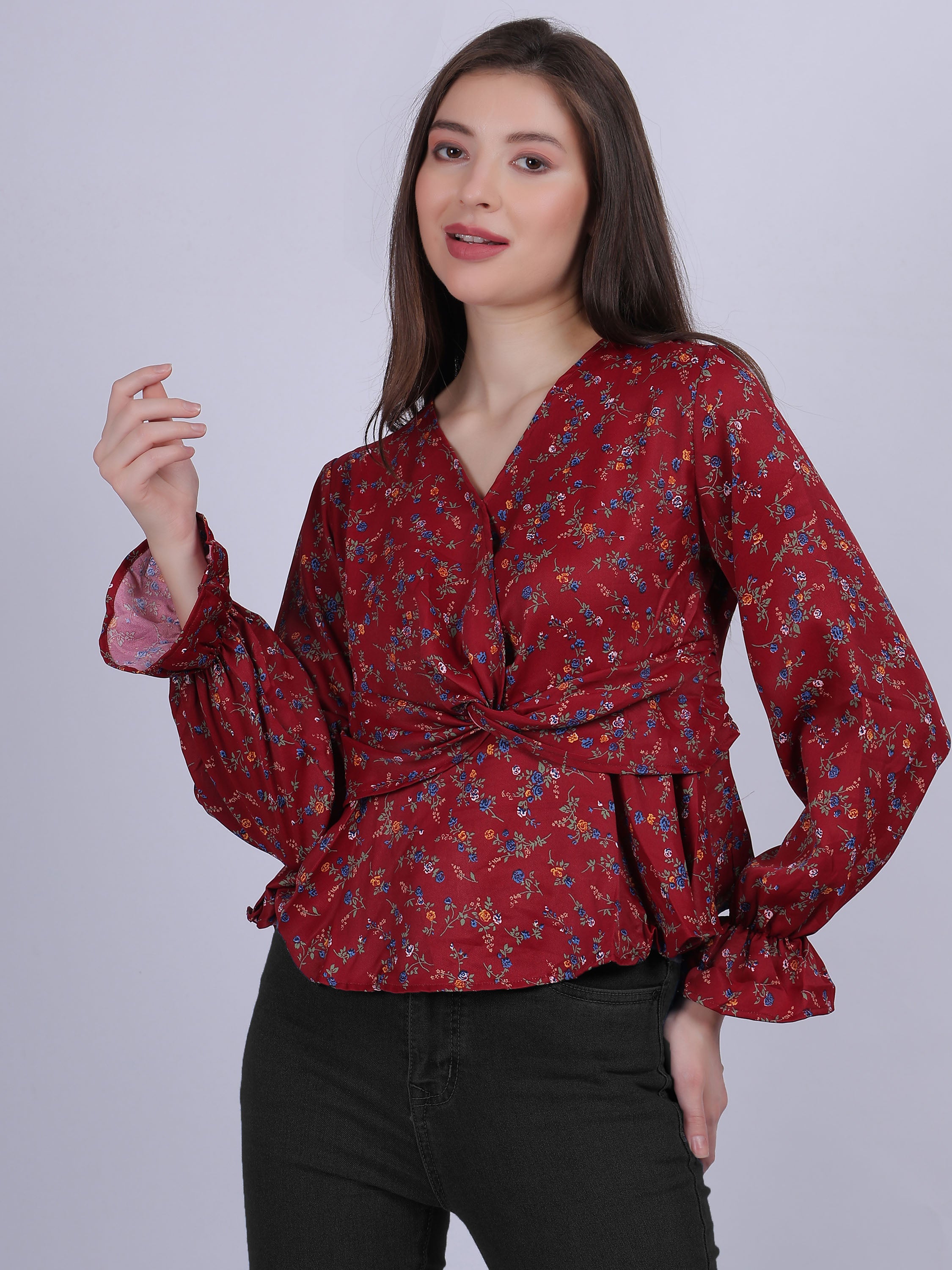 Maroon Floral Print Knot Style Crop Top