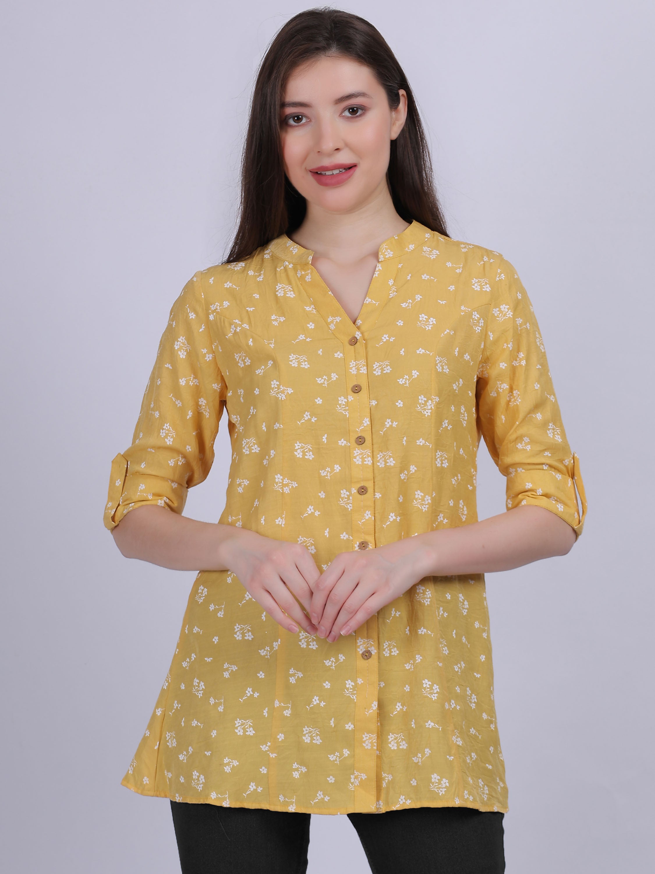 Floral Print Long Tunic Top With Turn-up Sleeves