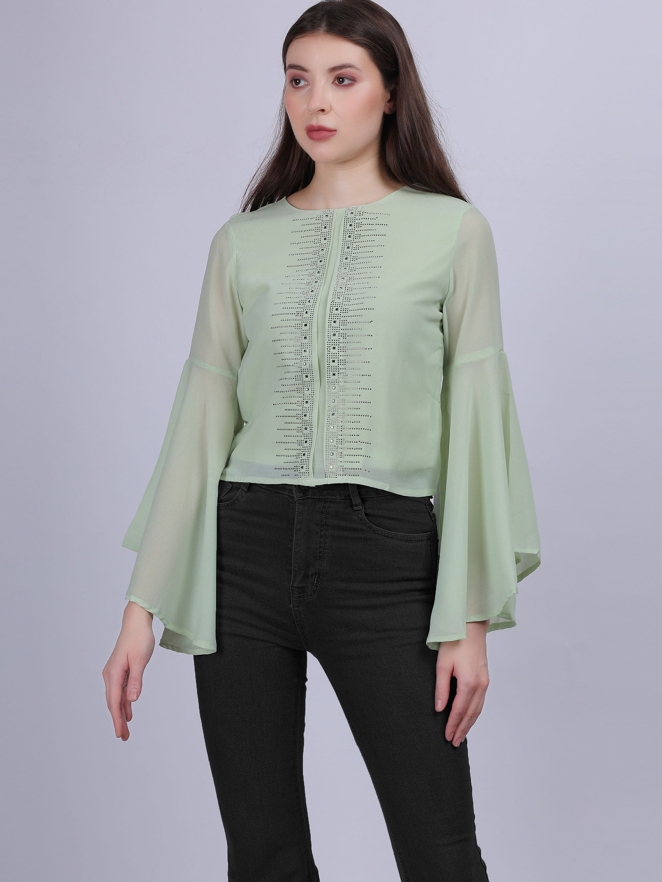 Green Solid Fashion Crop Top With Long Bell Sleeves & Stone Work Embellishment