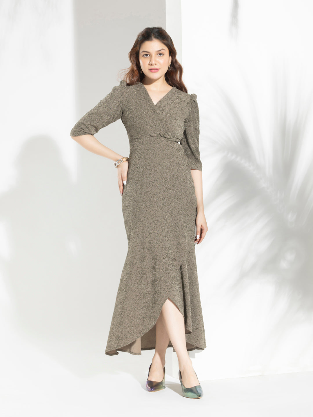 Introducing the AUMBE Wrapped Shimmer Party Wear Dress, a glamorous choice for your next event. Featuring a chic wrapped design and a shimmering fabric, this dress adds an elegant touch of sophistication and shine. Perfect for parties or formal occasions, it ensures you stand out with timeless style and confidence.
