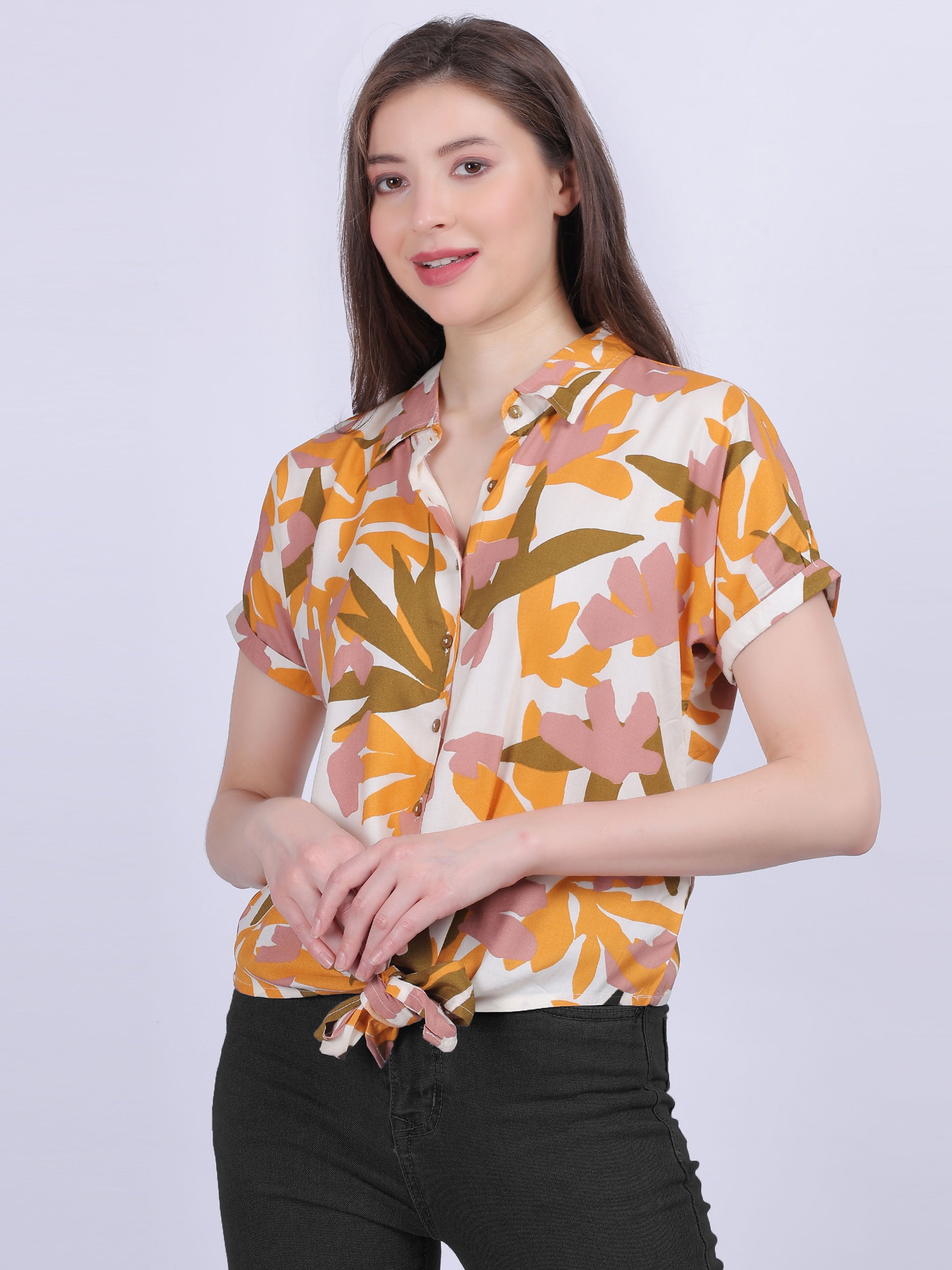 Introducing the AUMBE Leaf Print Knot Style Crop Shirt, a fresh and trendy addition to your wardrobe. This shirt features a lively leaf print and a stylish knot detail, offering a chic and contemporary look. Ideal for casual outings and summer days, it ensures you stay fashionable and comfortable with ease.
