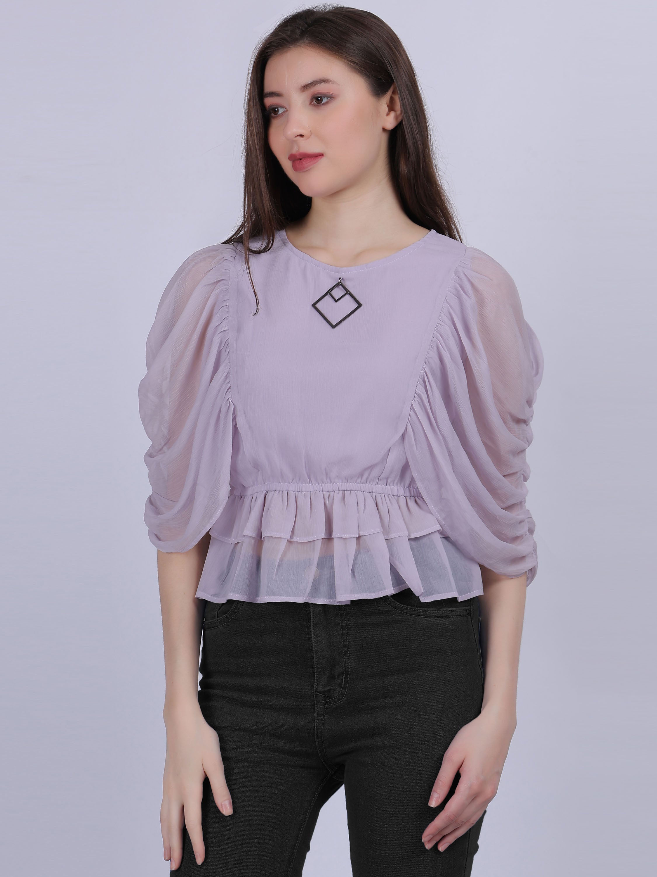 Lilac Basic Top With Fashion Ruffle Layered Sleeves With Metal Id Embellishment