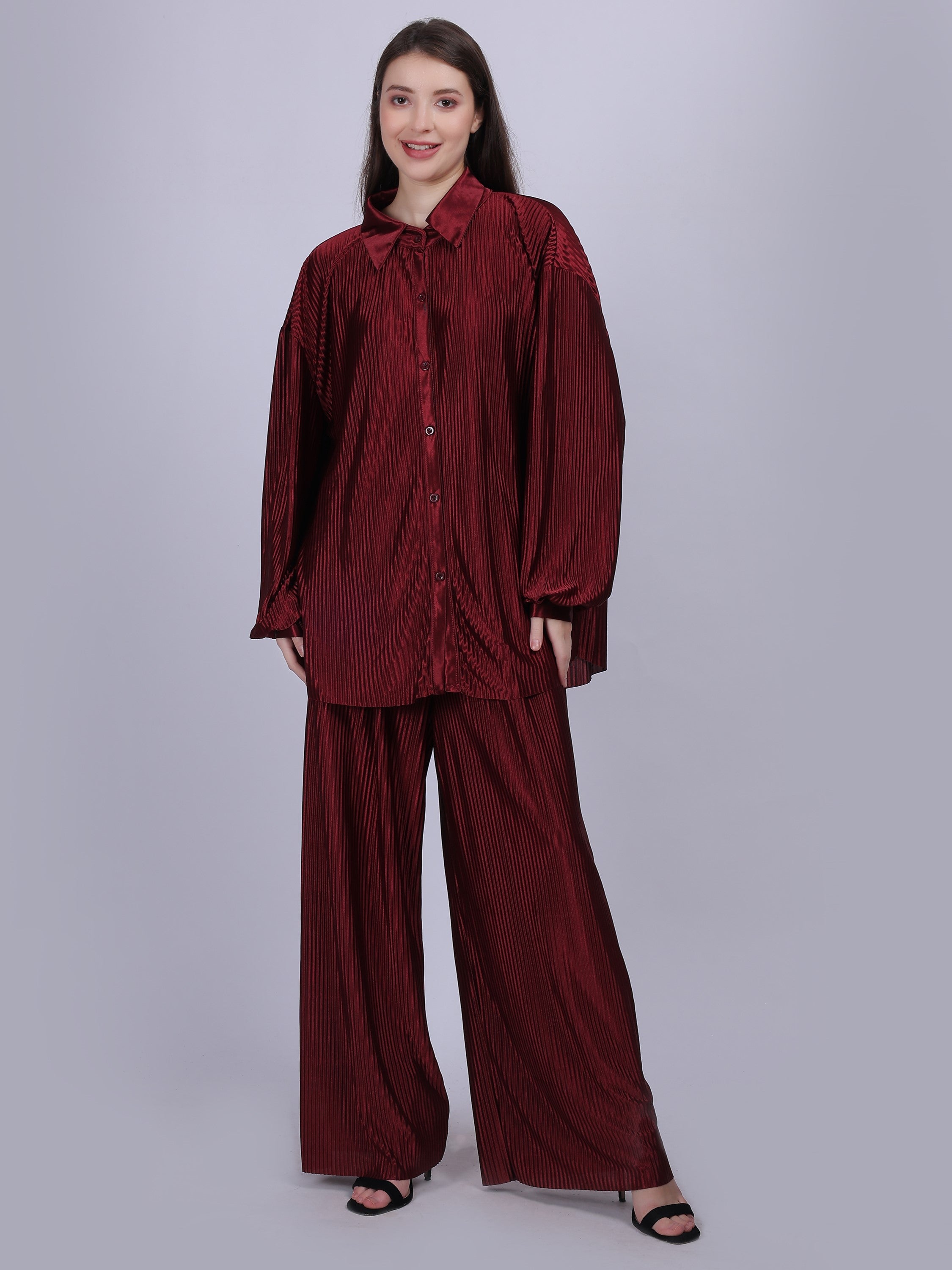 Maroon Pleated Fashion Co-ord Set With Straight Fit Pants