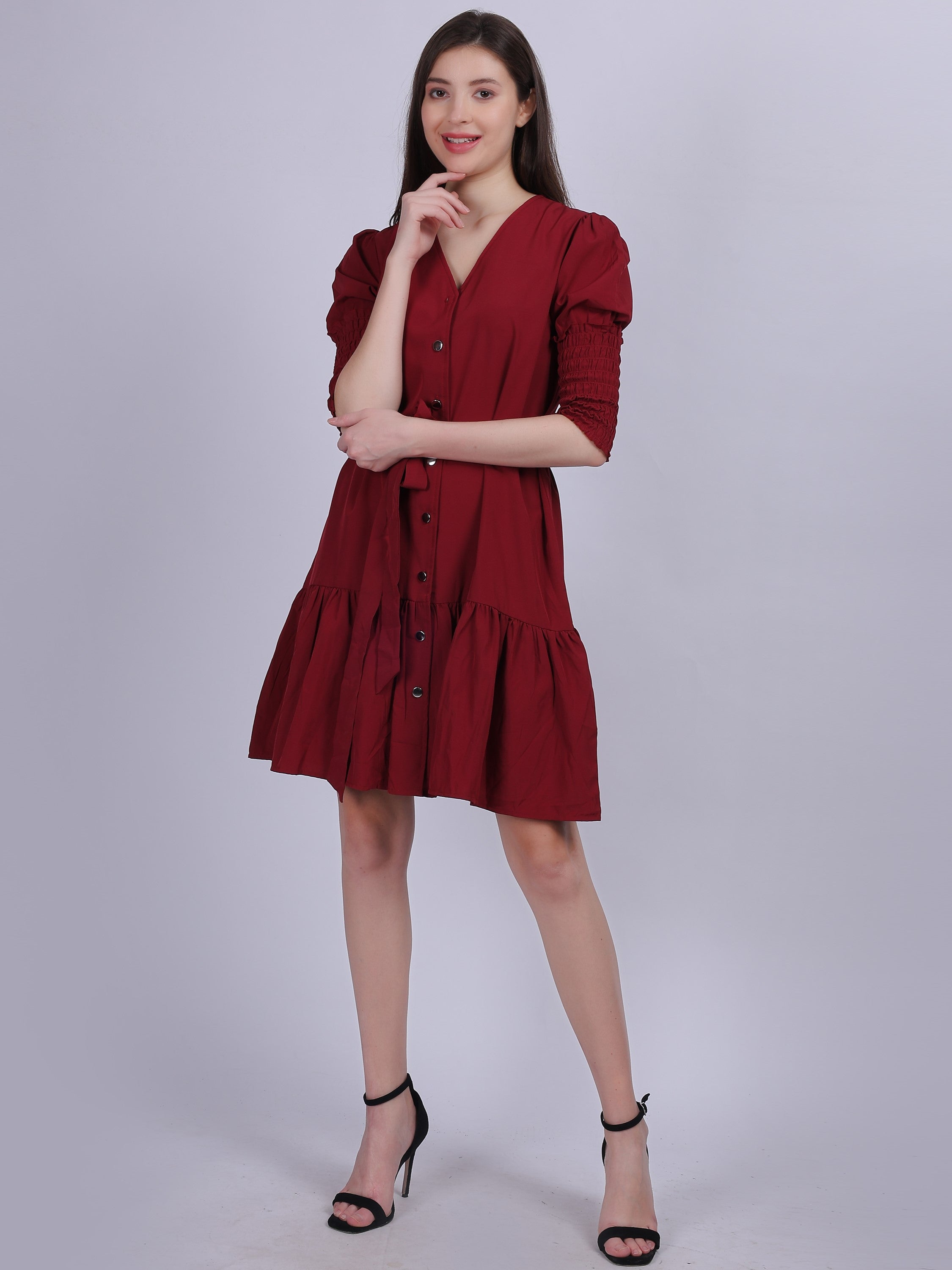 Maroon Fashion Shirt Dress With Smocking Sleeves & Belt On Waist