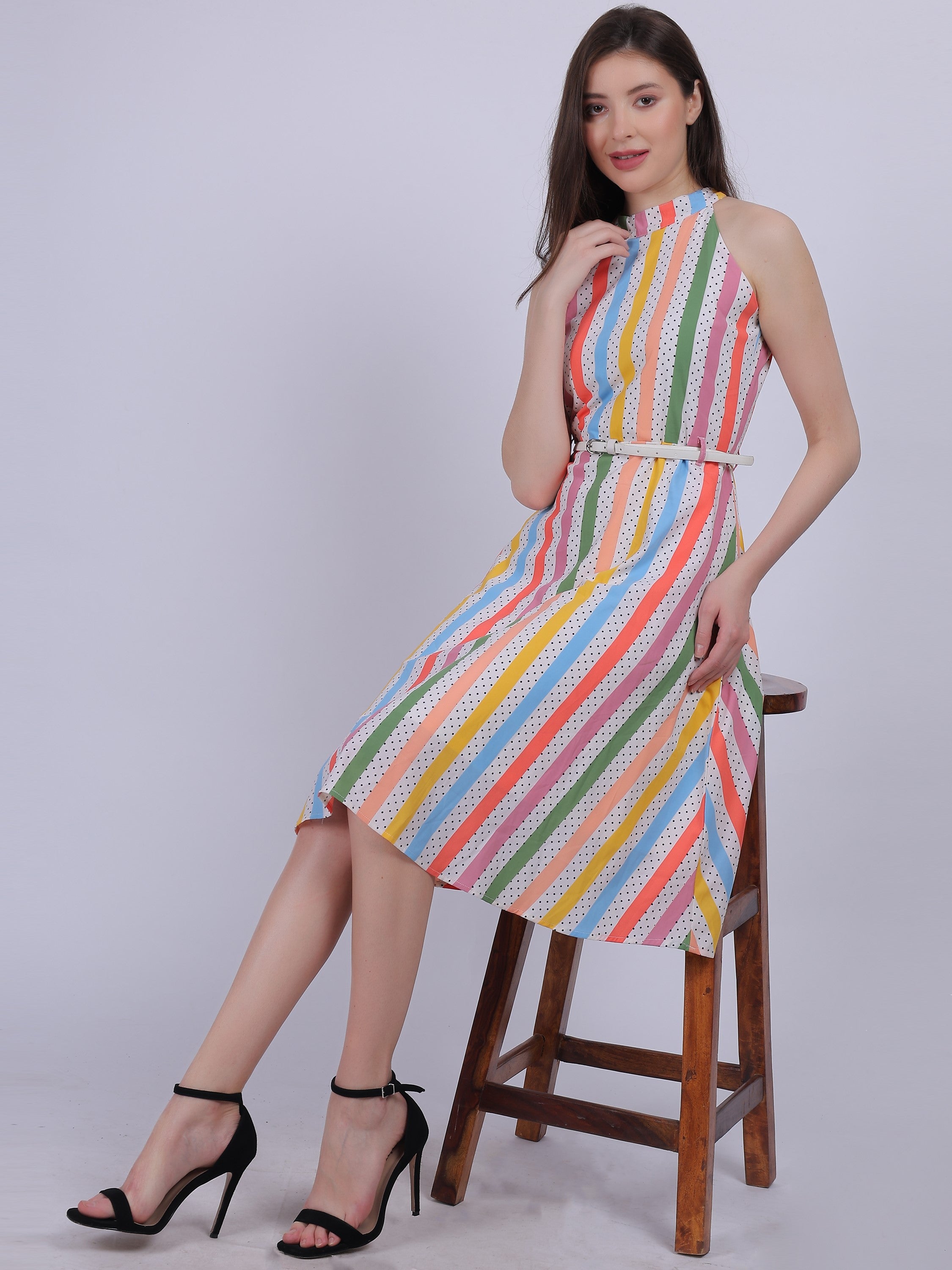 Introducing the AUMBE Multi Print Halter Neck Fashion Dress with Belt, a vibrant and stylish addition to your wardrobe. This dress features an eye-catching multi print and a chic halter neck design, complemented by a flattering belt at the waist. Perfect for both daytime events and evening outings, it ensures you look effortlessly elegant and on-trend.