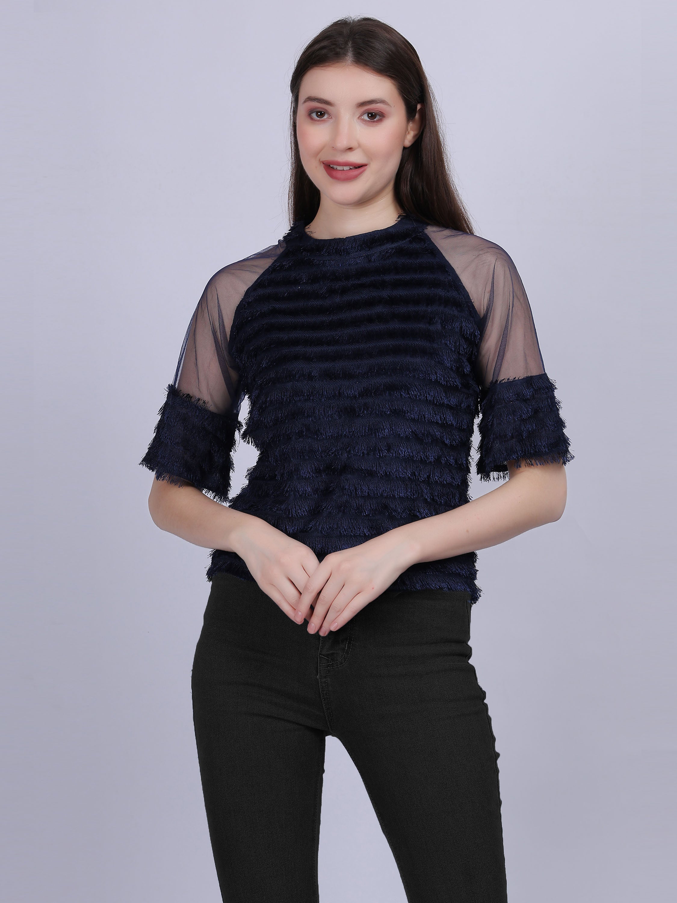 Navy Casual Soft Fur Crop Top With Mesh Sleeves