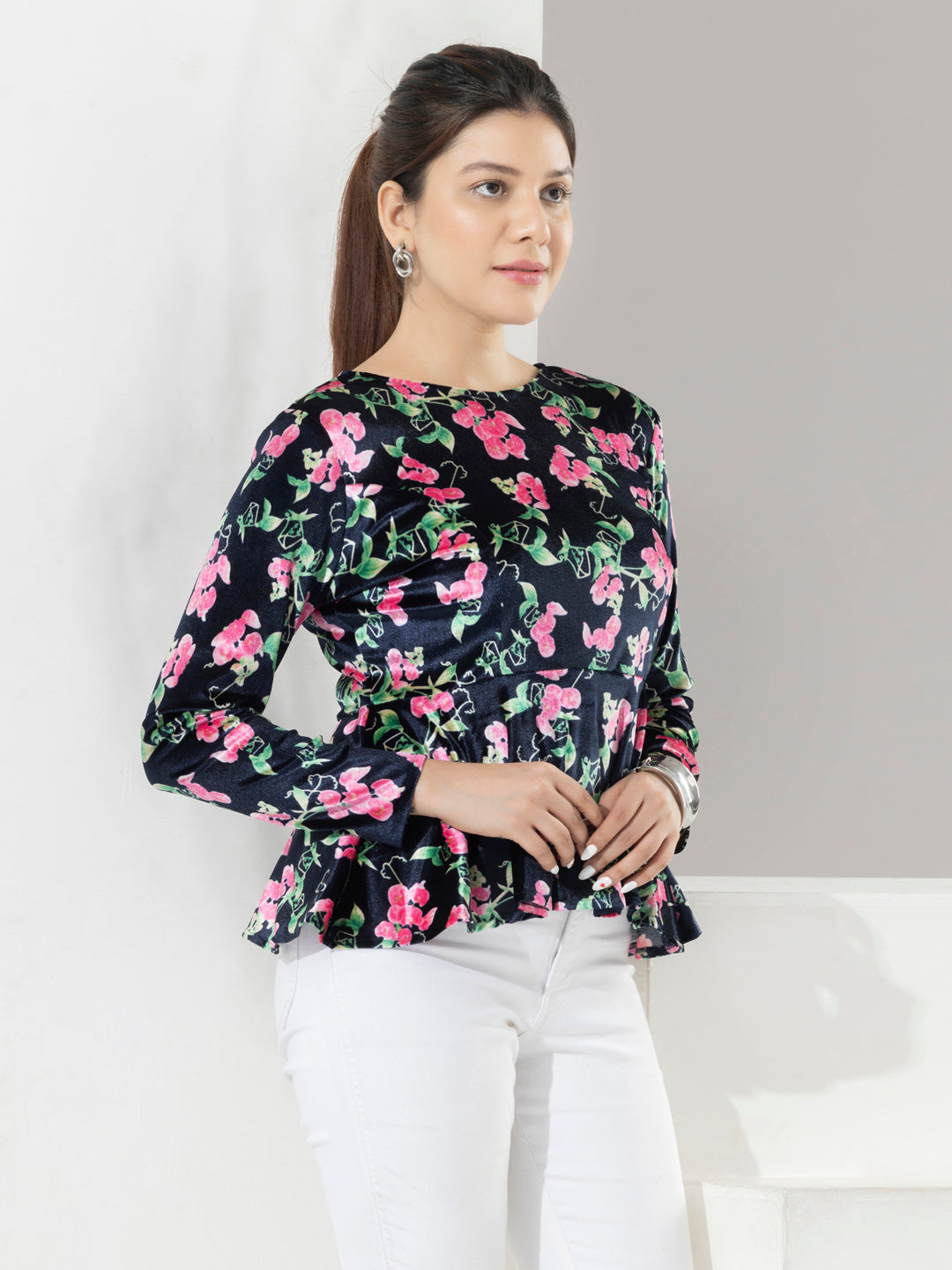 Introducing the AUMBE Floral Print Velvet Party Top, a luxurious choice for your evening wardrobe. Crafted from soft velvet with elegant floral prints, this top exudes sophistication and charm. Perfect for parties or special occasions, it ensures you stand out with effortless style.