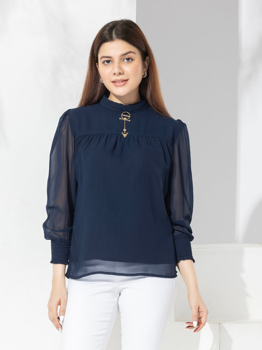 Introducing the AUMBE Solid High Neck Fancy Top, a timeless addition to your wardrobe. With its sleek high neck design and sophisticated solid color, this top offers both elegance and versatility. Perfect for layering or wearing alone, it’s an ideal choice for formal events or casual outings with a touch of refinement.