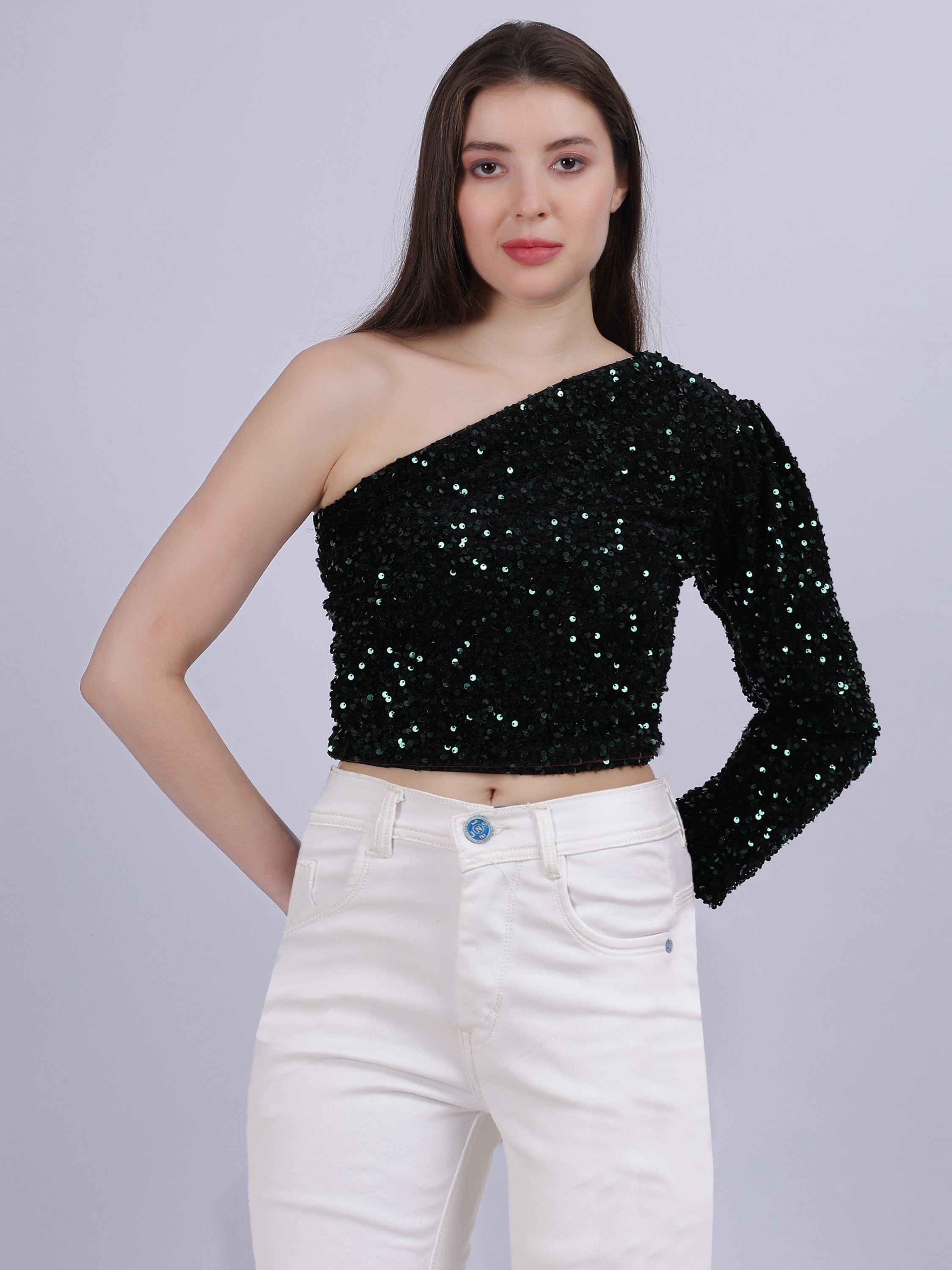 Introducing the AUMBE One-Shoulder Sequin Crop Fashion Top, a bold and glamorous addition to your wardrobe. This top features dazzling sequins and a trendy one-shoulder design, offering a chic and eye-catching look. Perfect for parties or special events, it ensures you stand out with confidence and style.