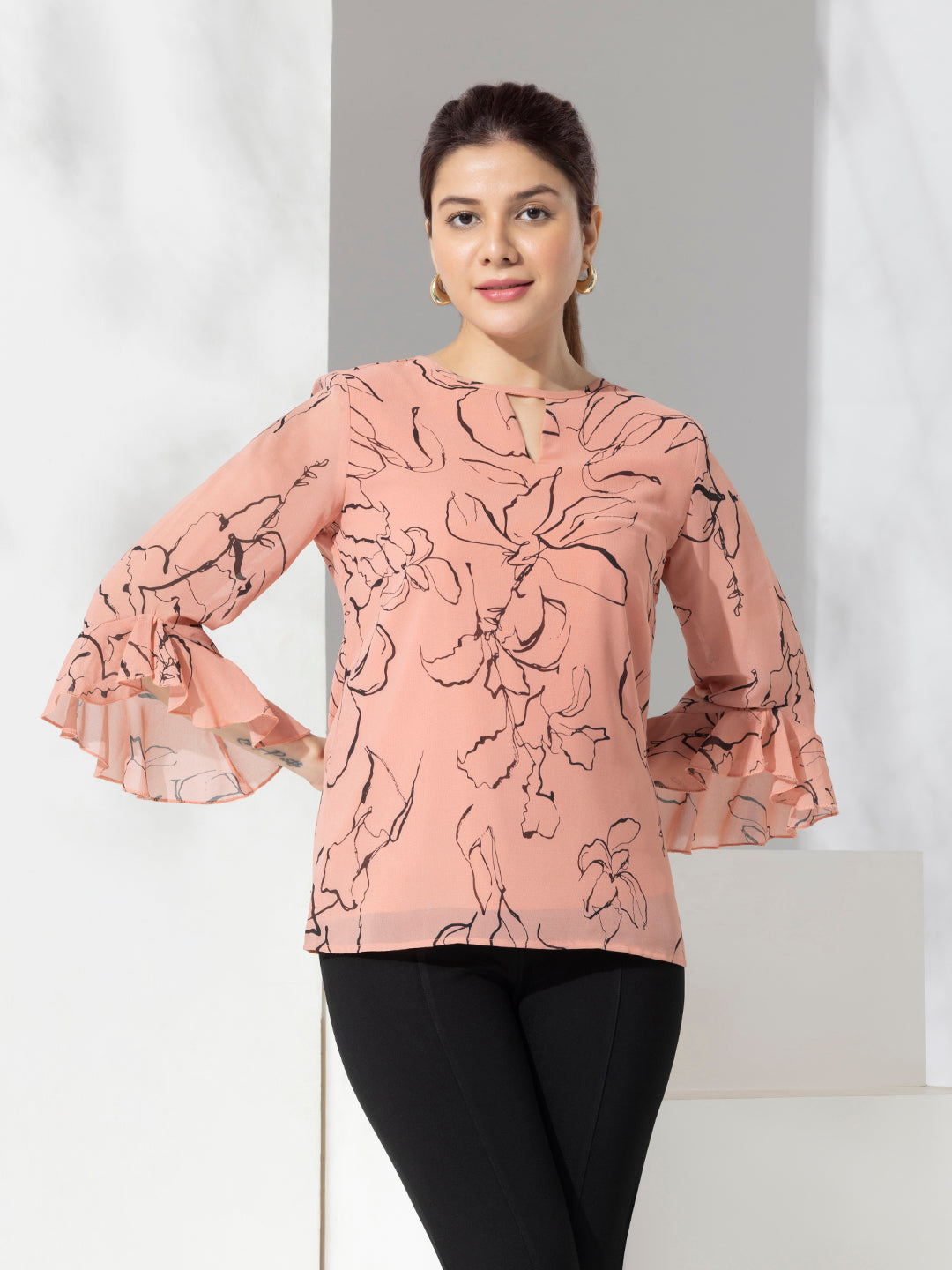 Pink Abstract Print Fancy Top With Bell Sleeves