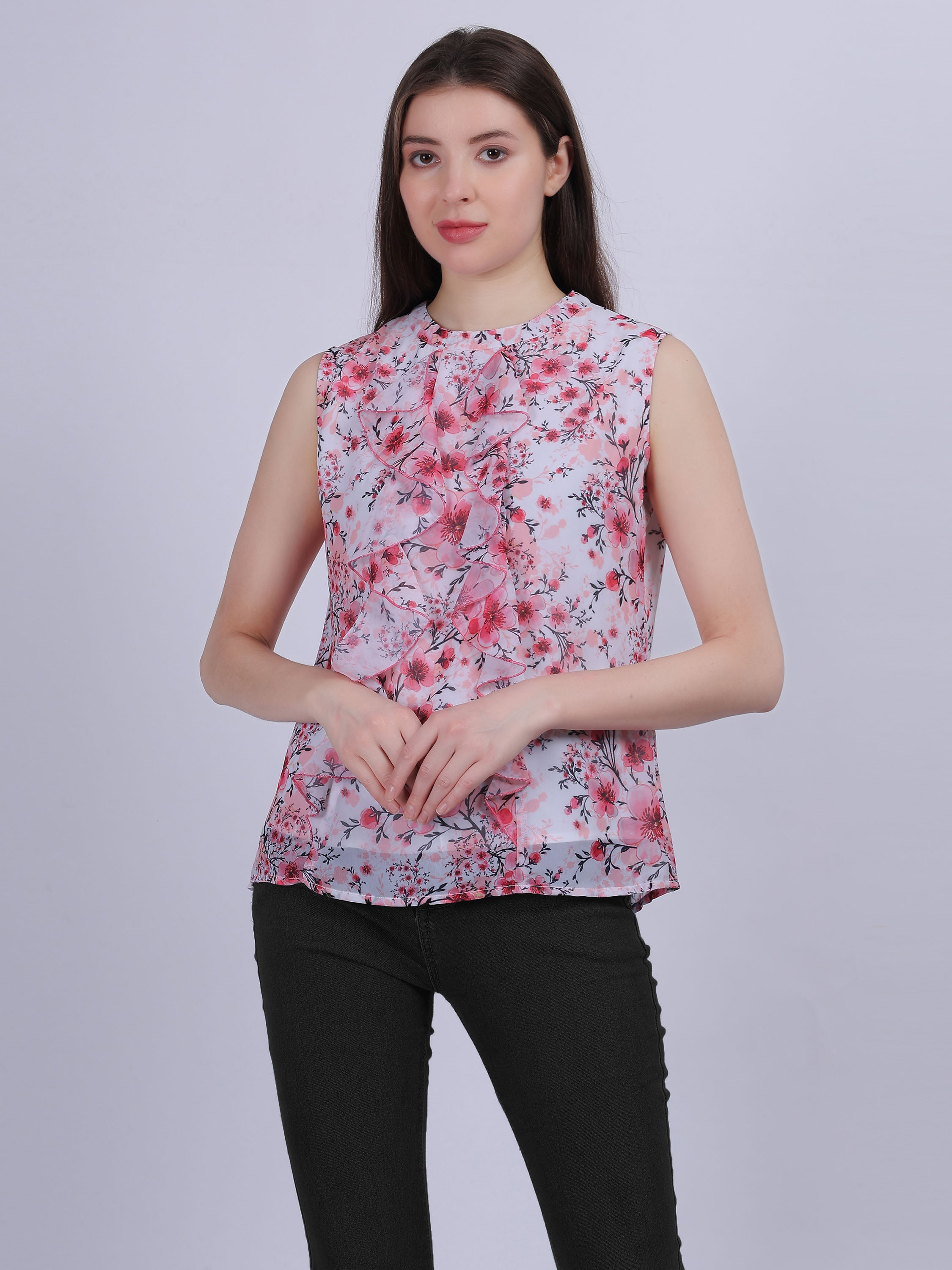 Introducing the AUMBE Floral Print Basic Fashion Ruffle Top. This charming top features a vibrant floral print and playful ruffle details, blending casual elegance with a touch of whimsy. Ideal for adding a fresh and feminine touch to your everyday wardrobe, it effortlessly combines style and comfort.