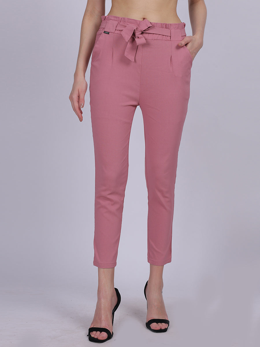 Pink Solid Narrow Fit Trouser With Attached Fabric Belt