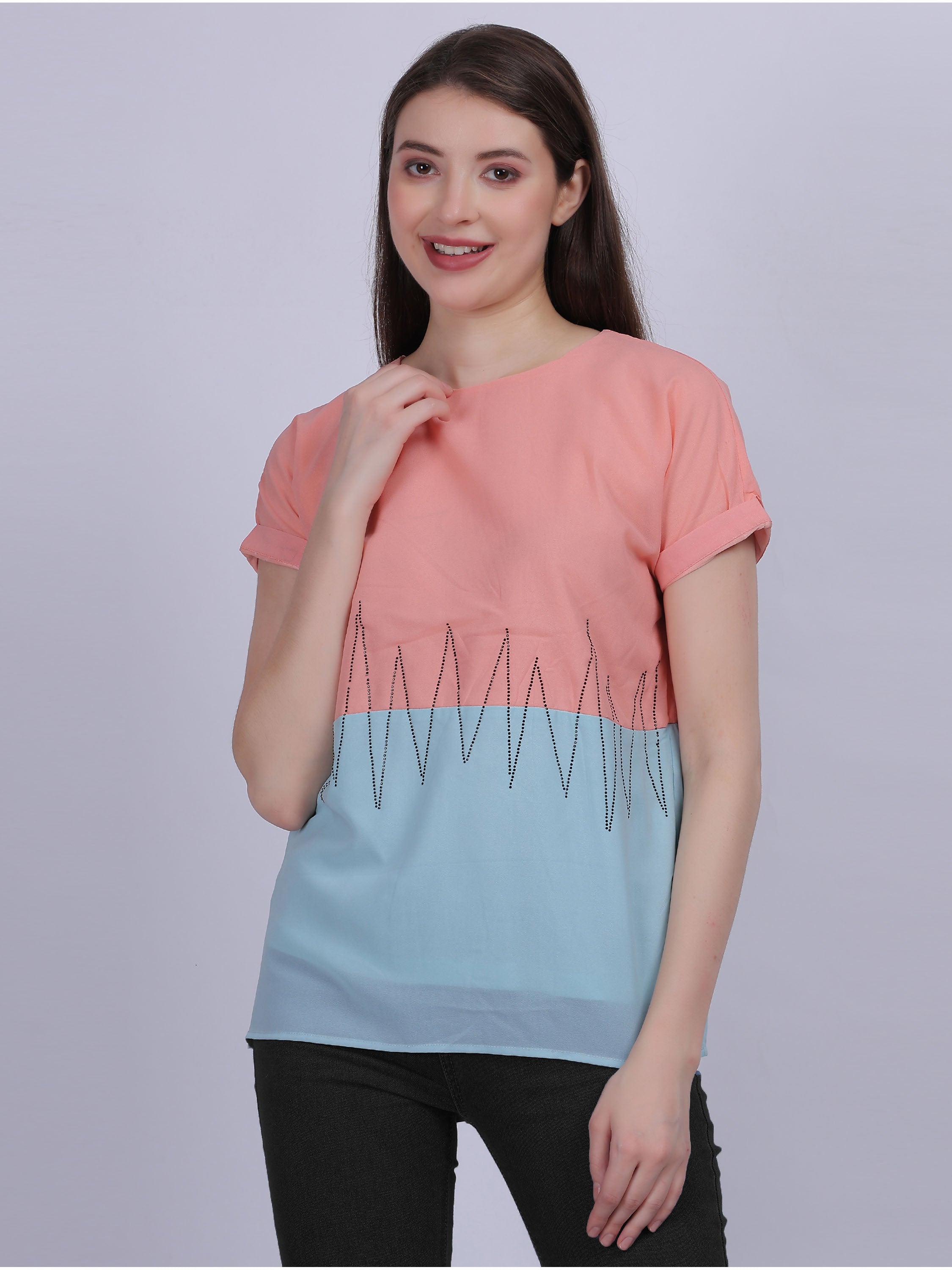 Introducing the AUMBE Solid Ombre Effect Top with Stone Work Embellishment, a stunning blend of elegance and modern design. This top features a gradient ombre effect with exquisite stone work embellishments, adding a touch of sparkle and sophistication. Perfect for both casual and semi-formal occasions, it ensures you stand out with grace and style.