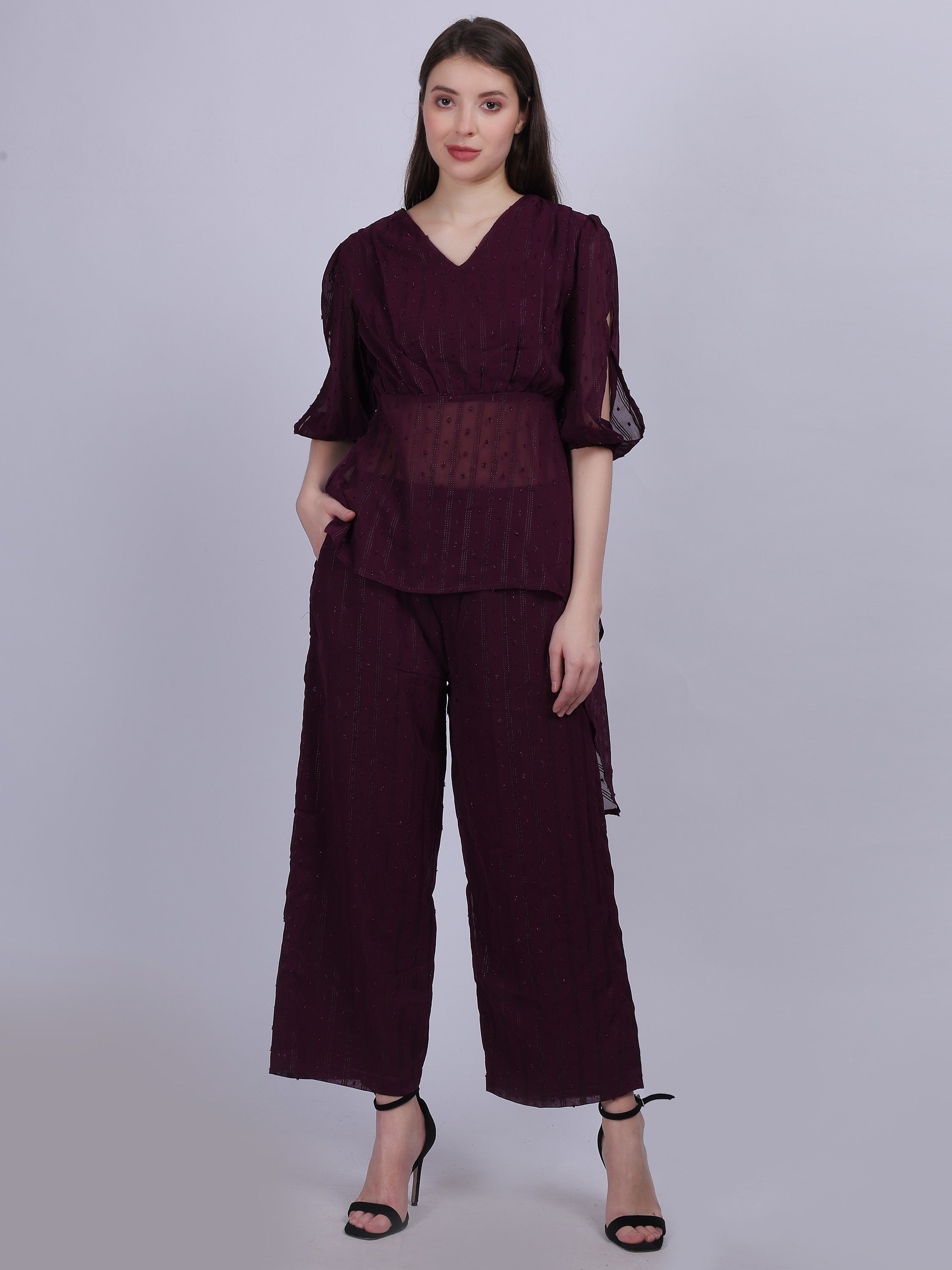 Wine Fashion Cord-set With Asymmetric Top & Straight Fit Pant