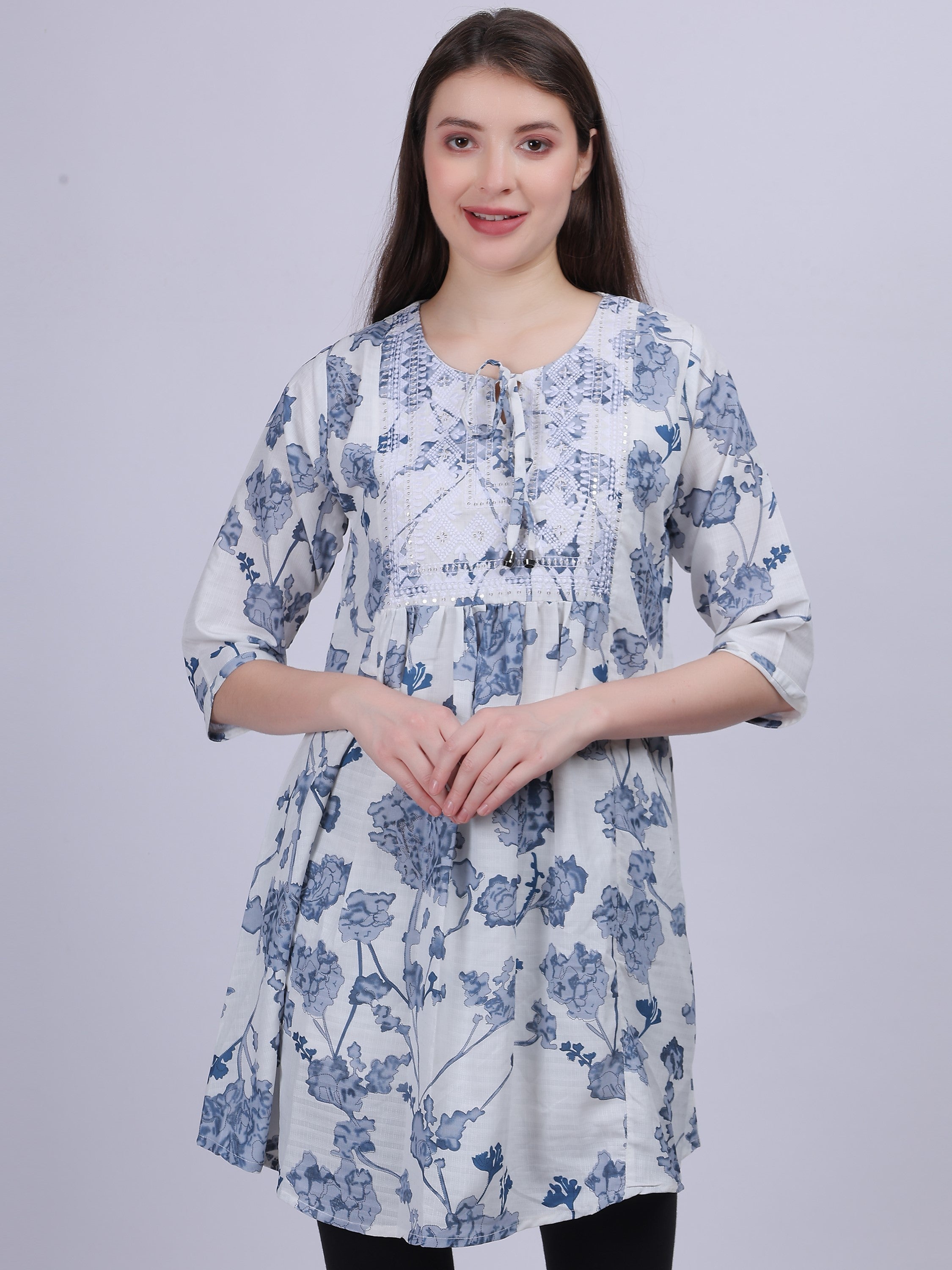 Sky Blue Floral Print Long Tunic Fashion Top With Neck Embroidery