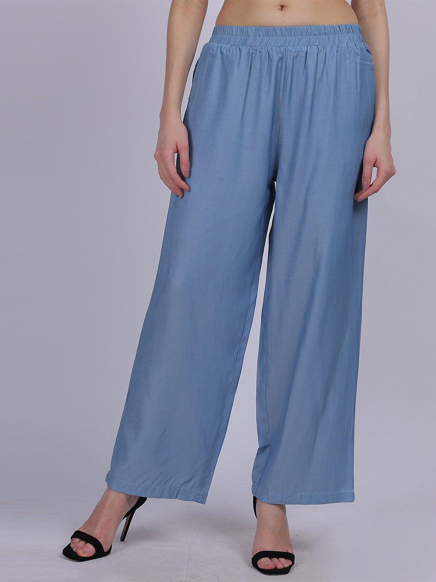 Sky Blue Silky Denim Straight Fit Fashion Pants