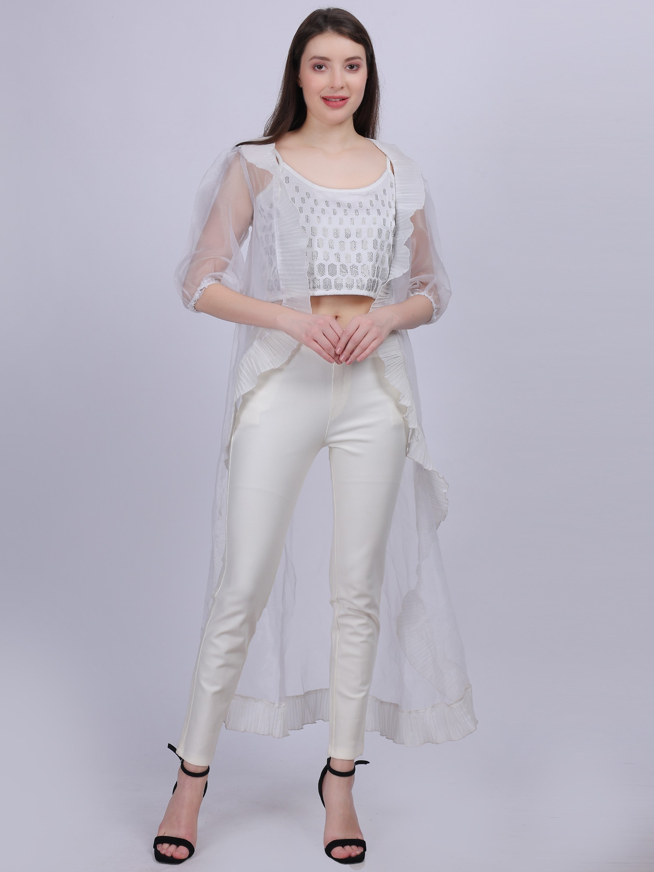 Elevate your wardrobe with this chic 3-piece set, featuring a trendy spaghetti top, comfortable cotton stretch pants, and a stylish mesh long shrug. Perfect for a casual day out or a relaxed evening, this versatile ensemble offers a seamless blend of comfort and fashion. Mix and match for endless style possibilities!