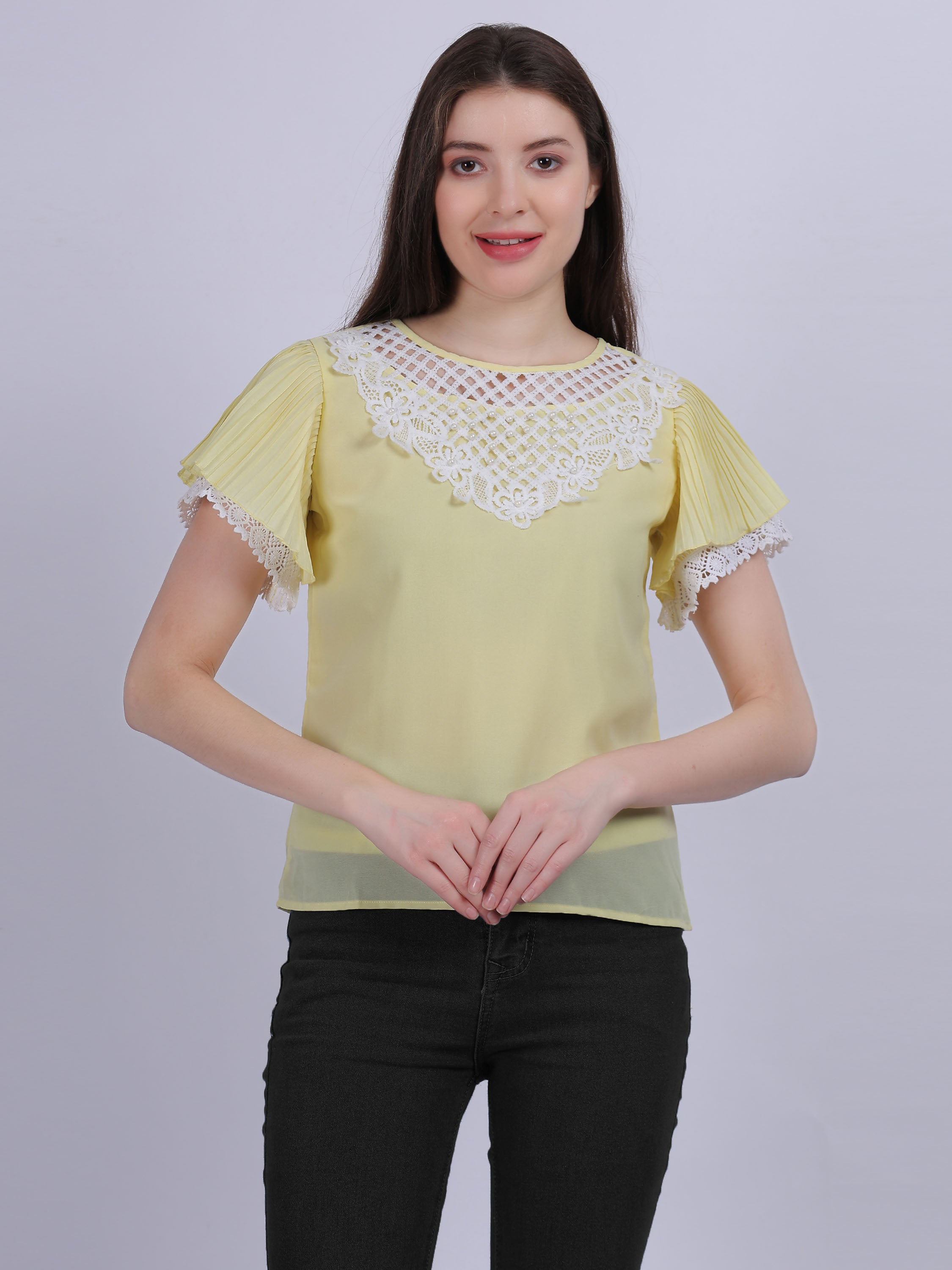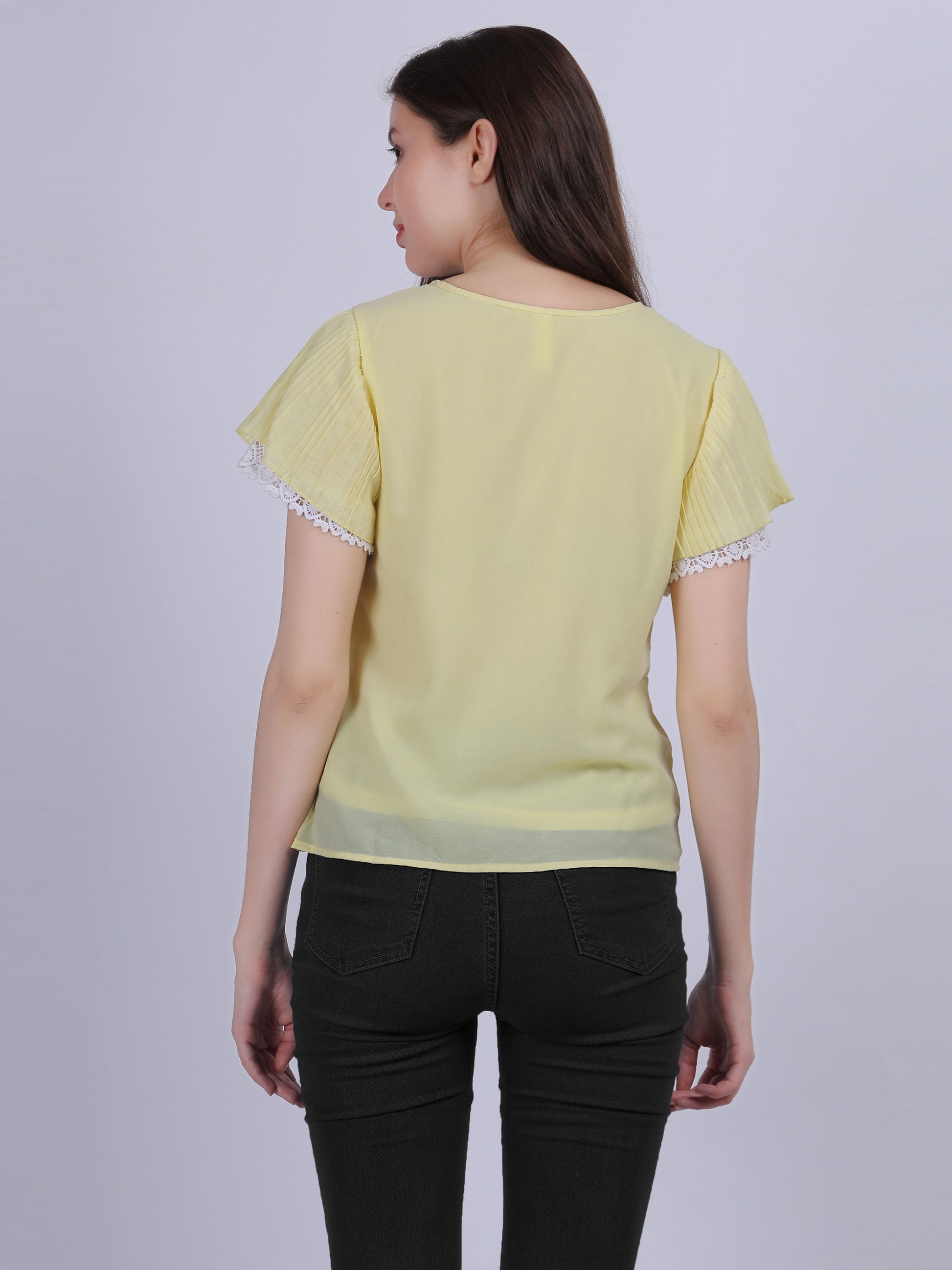 Yellow Solid Basic Casual Top With Lace Embellishment