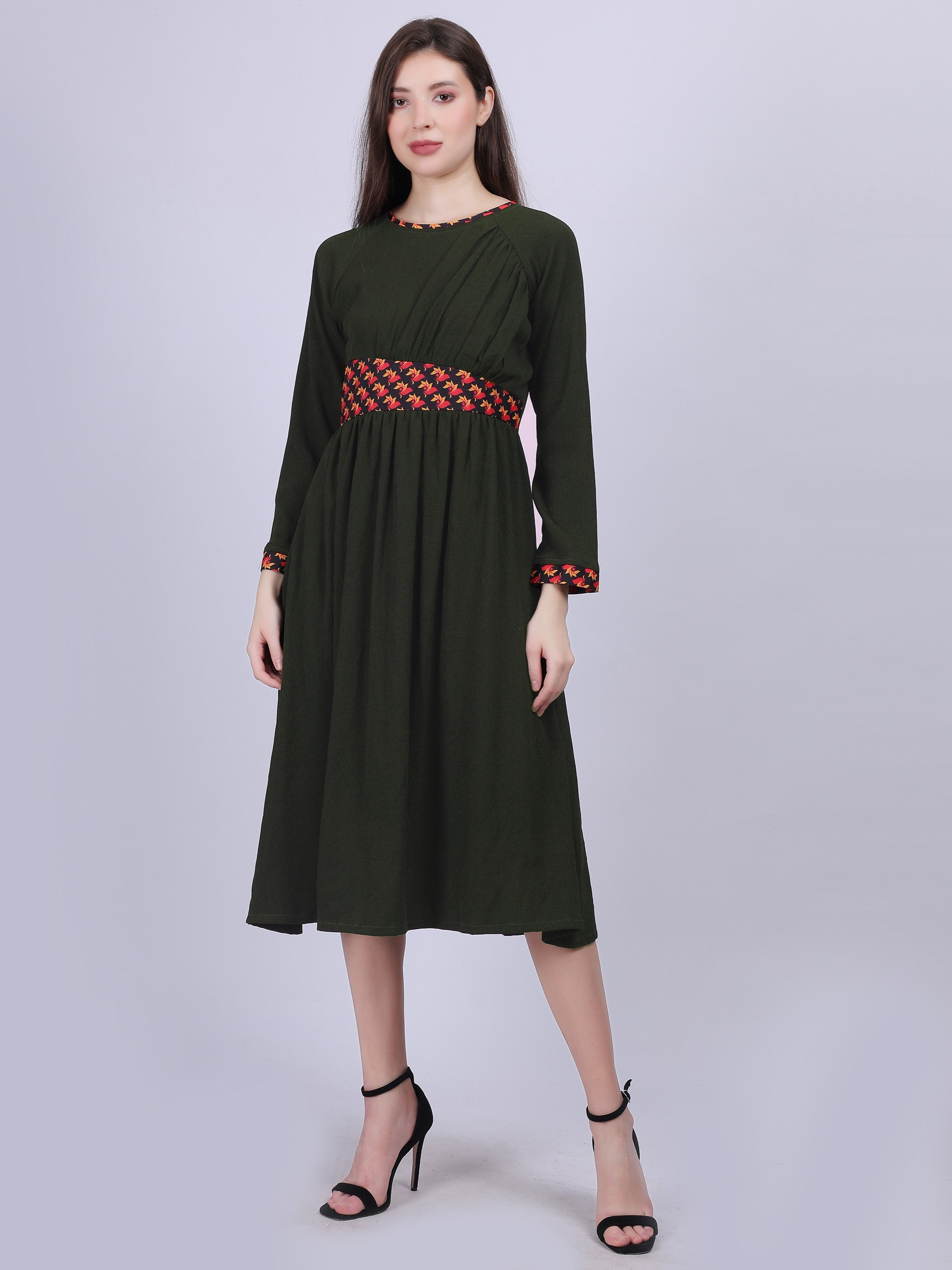 Solid Fashion Dress With Stylish Printed Collar And Waist Belt