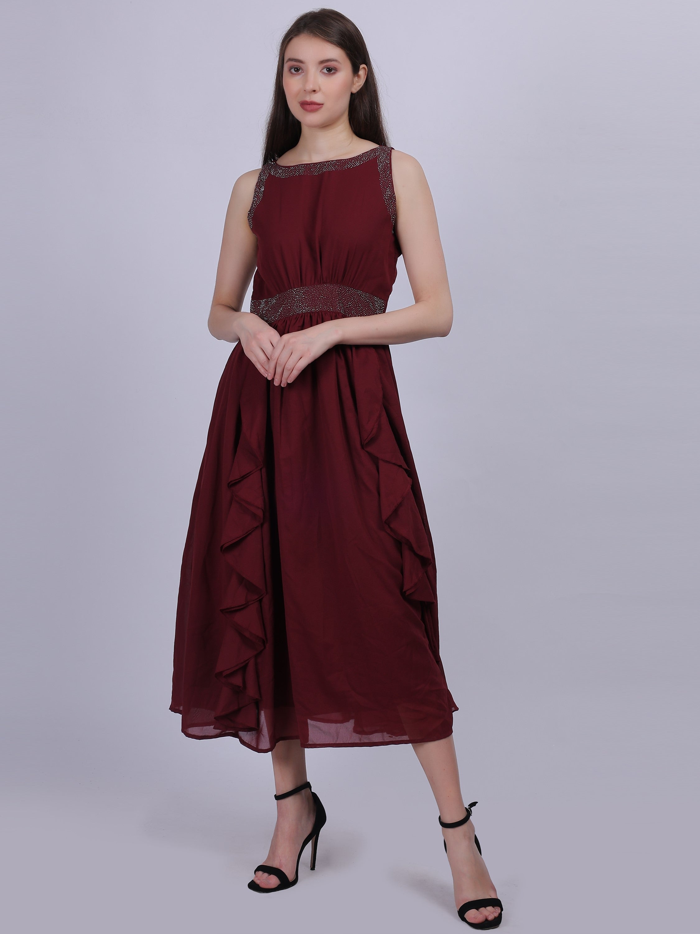 The AUMBE Solid Fashion Long Dress with Stone Work combines classic elegance with a touch of sparkle. This full-length dress features a solid color design, highlighted by intricate stone work that adds a glamorous and sophisticated detail. Perfect for formal events or special occasions, it offers a stylish and refined look with a focus on timeless beauty and subtle embellishment.
