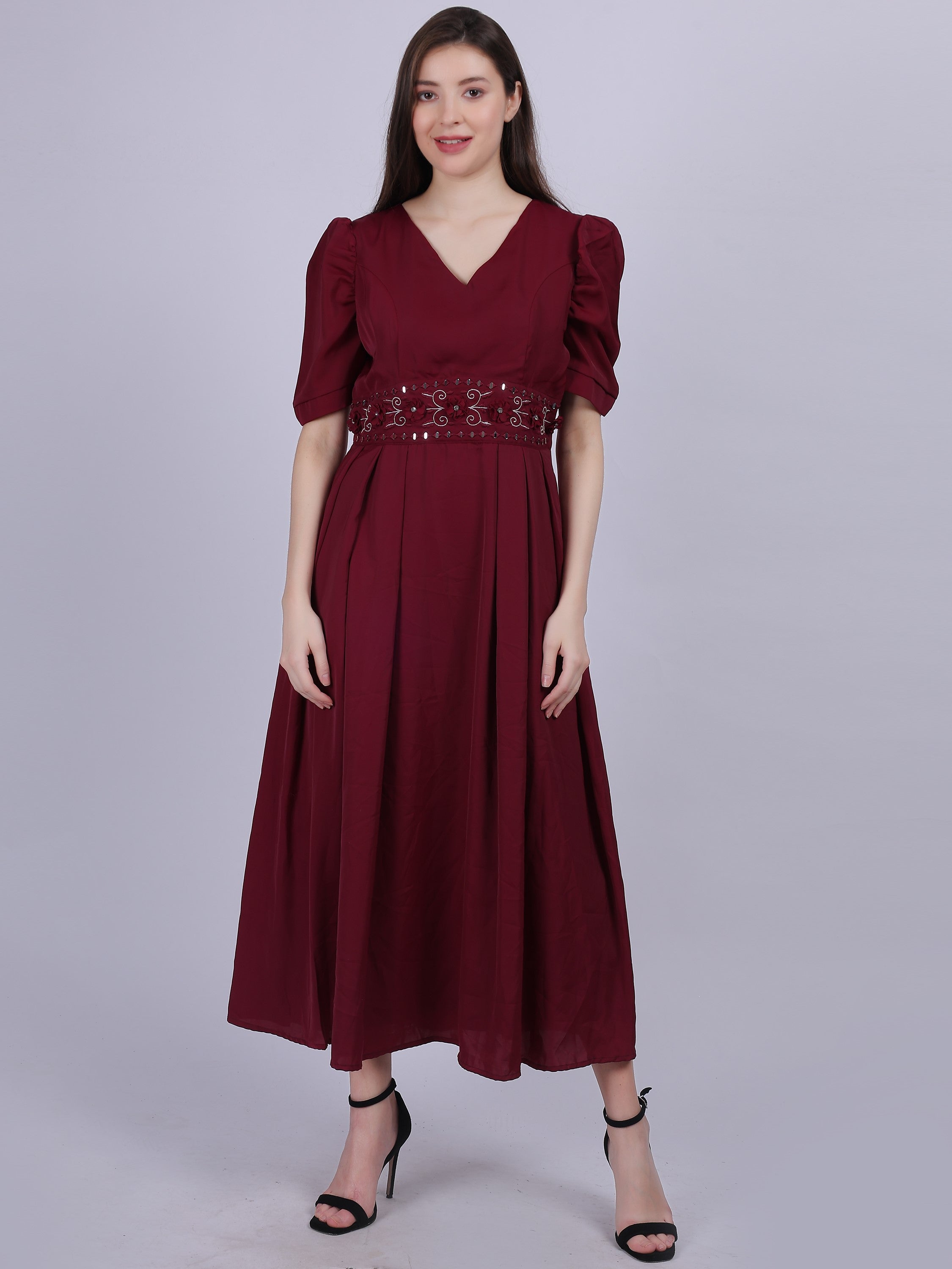 Introducing the AUMBE Solid Fashion Pleated Dress with Waist Handwork Embroidery, a refined and elegant choice for your wardrobe. This dress features graceful pleats and exquisite handwork embroidery at the waist, combining sophisticated design with artisanal detail. Perfect for formal events and special occasions, it ensures you stand out with timeless style and grace.