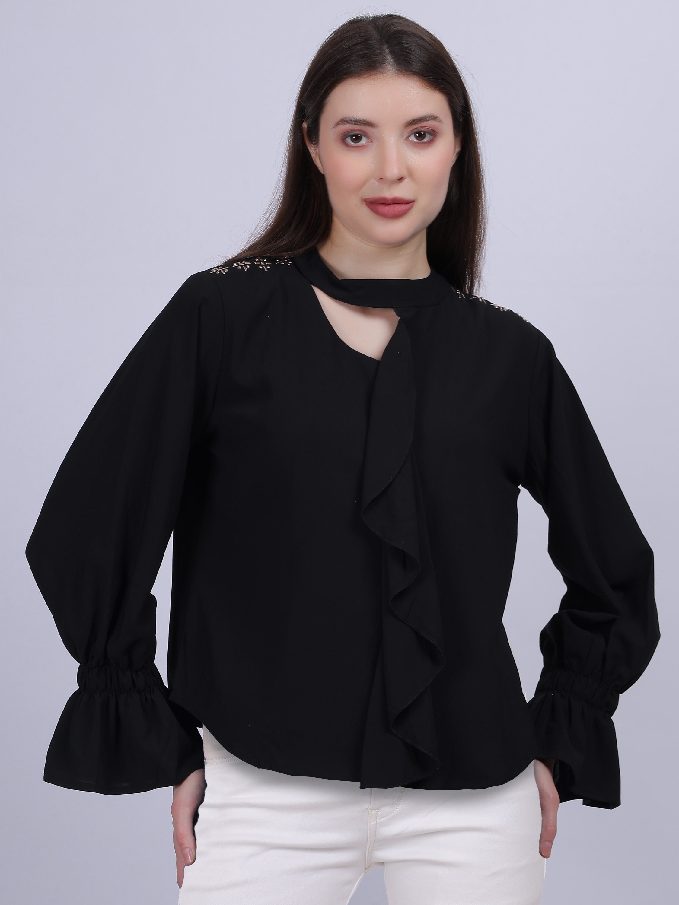 Introducing the AUMBE Solid Fashion Top with Ruffles and Stone Work. This elegant top combines classic solid fabric with playful ruffles and intricate stone embellishments, adding a touch of sophistication and glamour to your wardrobe. Perfect for both casual outings and special occasions.