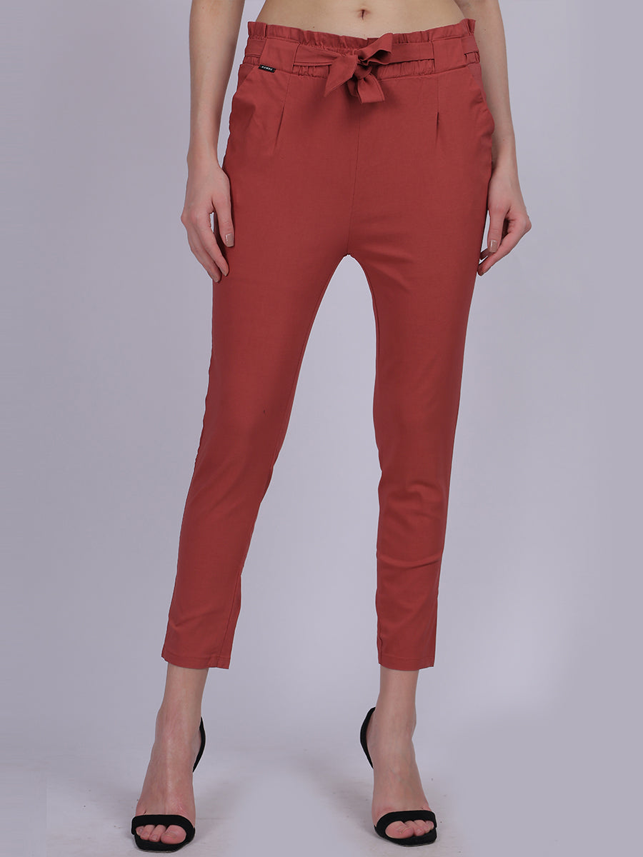 Rust Solid Narrow Fit Trouser With Attached Fabric Belt