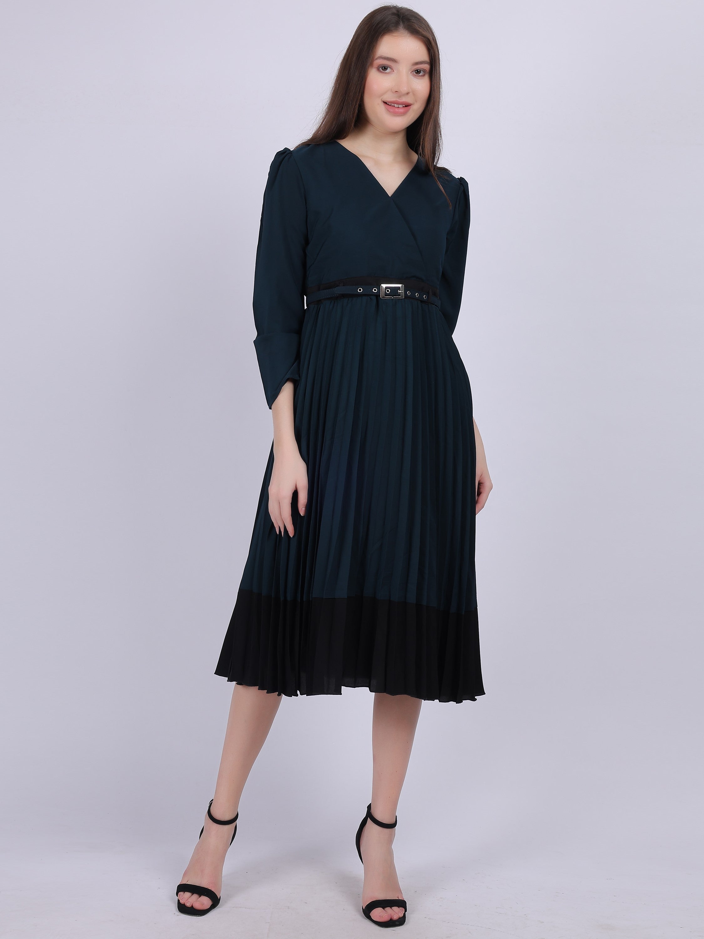 Teal Solid Pleated Fashion Dress With Puff Sleeves