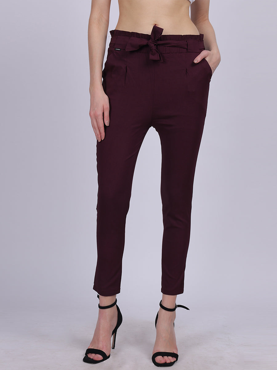 Wine Solid Narrow Fit Trouser With Attached Fabric Belt