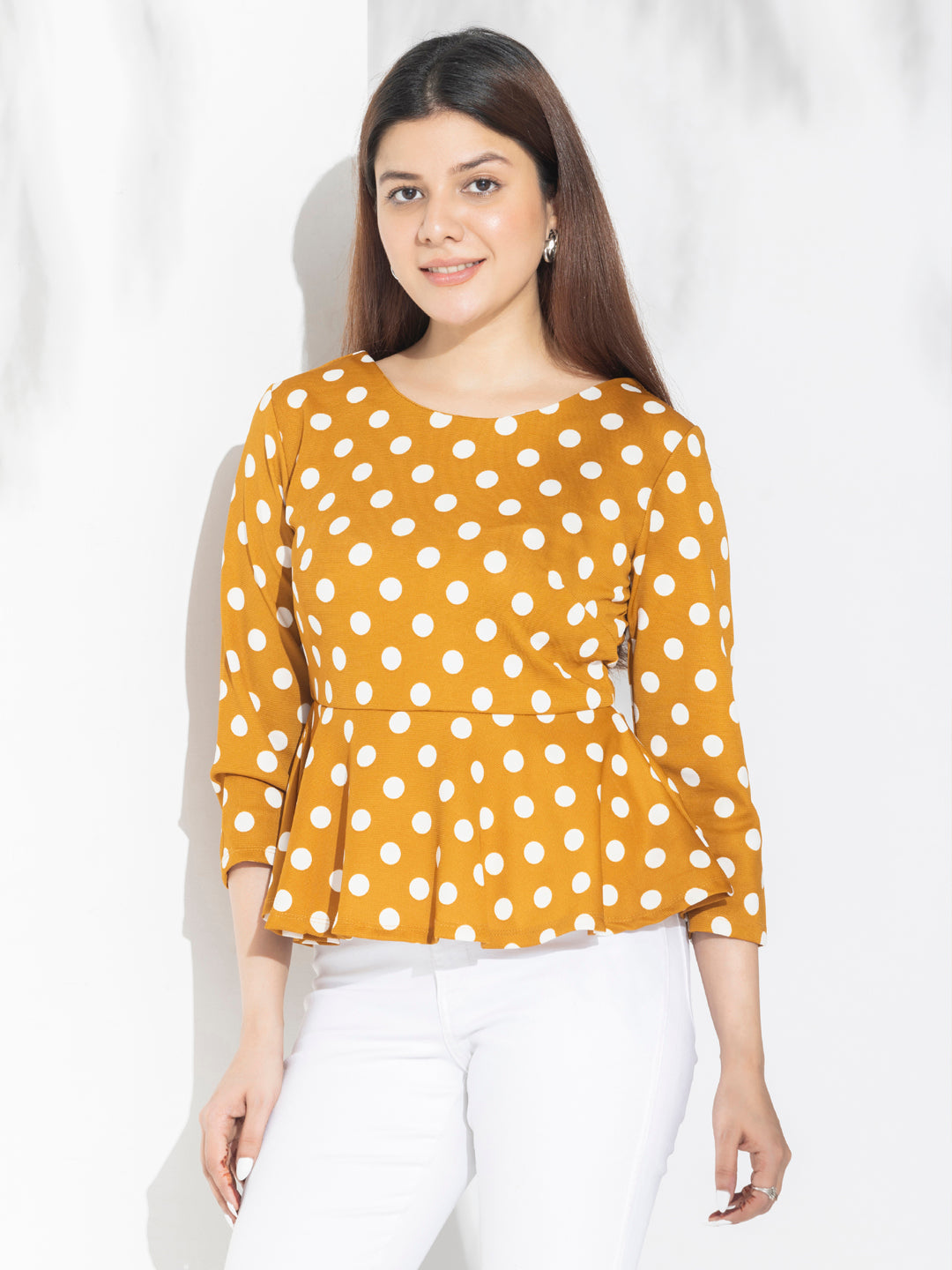 Yellow Polka Dots Peplum Top With Fashion Knot At Back